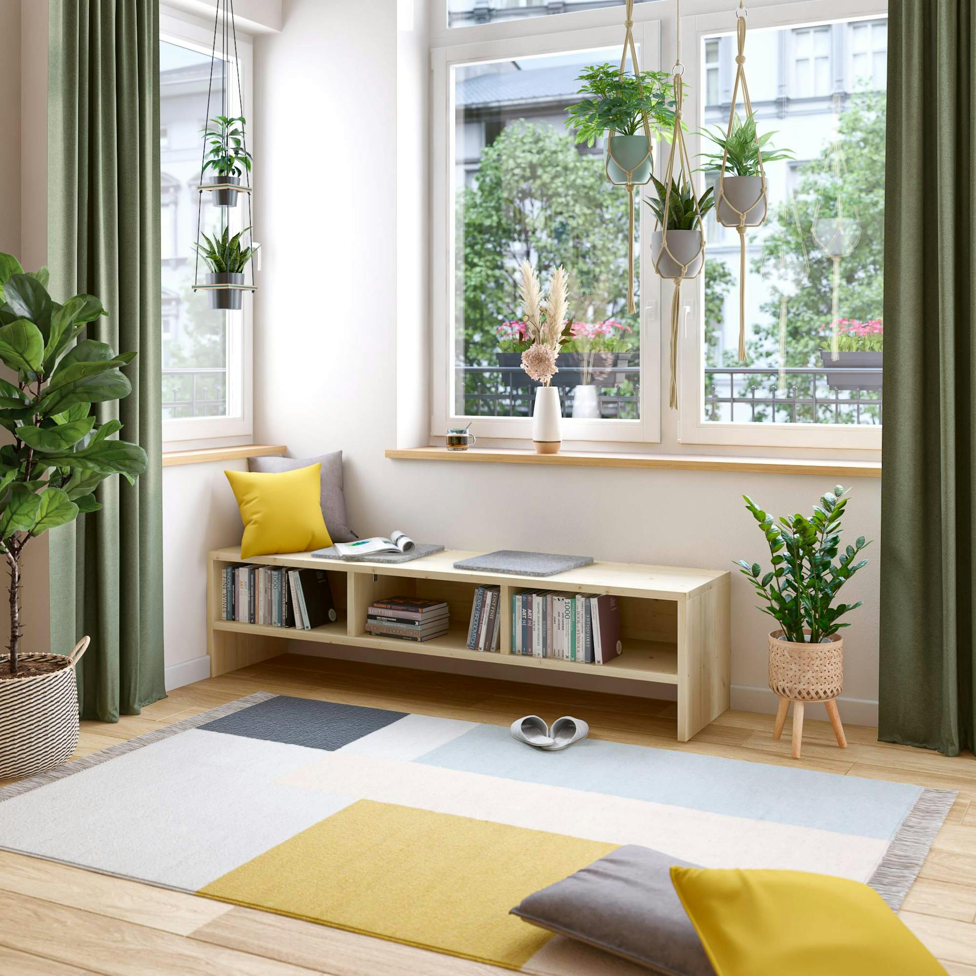 Diese von Dir gebaute Sitzbank eignet sich perfekt, um sie vor dein Fenster zu stellen und es sich darauf mit einigen Kissen gemütlich zu machen. So hast du einen hellen Fenstersitzplatz zum Entspannen und Genießen. Die Sitztiefe von 45 cm bietet dir genug bequemen Sitz- und Liegeplatz und in den Fächern darunter kannst du kleinere Dinge wie Bücher und Zeitschriften verstauen. Die eingerückte Rückwand sorgt dabei für ausreichende Luftzirkulation an den Außenwänden.