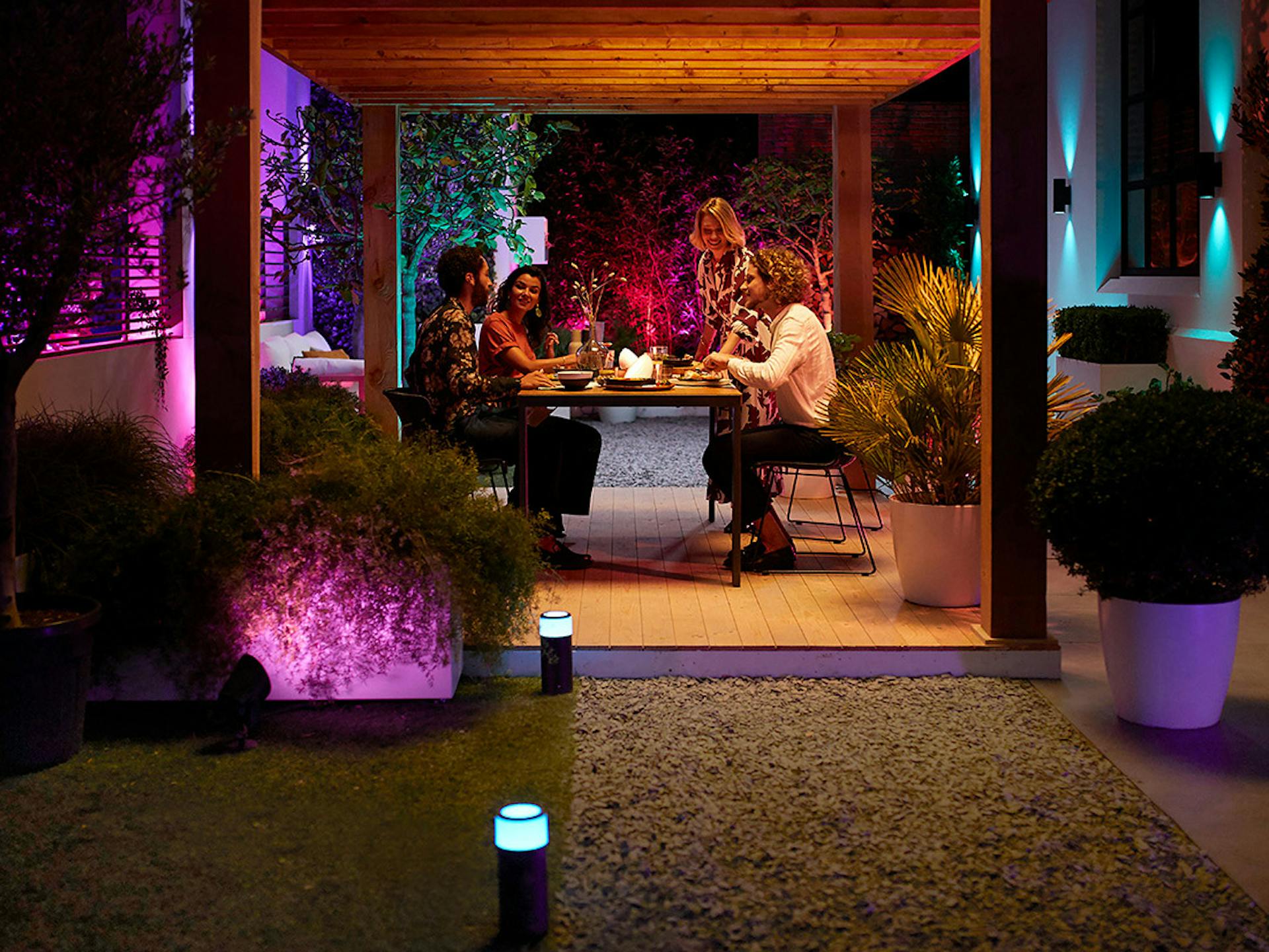 Ob du nach der Arbeit ein Buch auf dem Balkon lesen oder mit Freunden Samstagabend im Garten grillen willst - mit Philips Hue kannst du dir immer das passende Licht einstellen. Von stilvollem, indirekten Licht über Lichtszenen mit wechselnden Farben und Helligkeitsstufen zu hellem, warmweißen Licht: Entscheide dich passend zu deiner Stimmung und dem Anlass für die richtige Lichteinstellung. Alles, was du dazu brauchst, sind Philips Hue Außenleuchten, die du mit einem smarten Philips Hue Beleuchtungssystem verbindest.