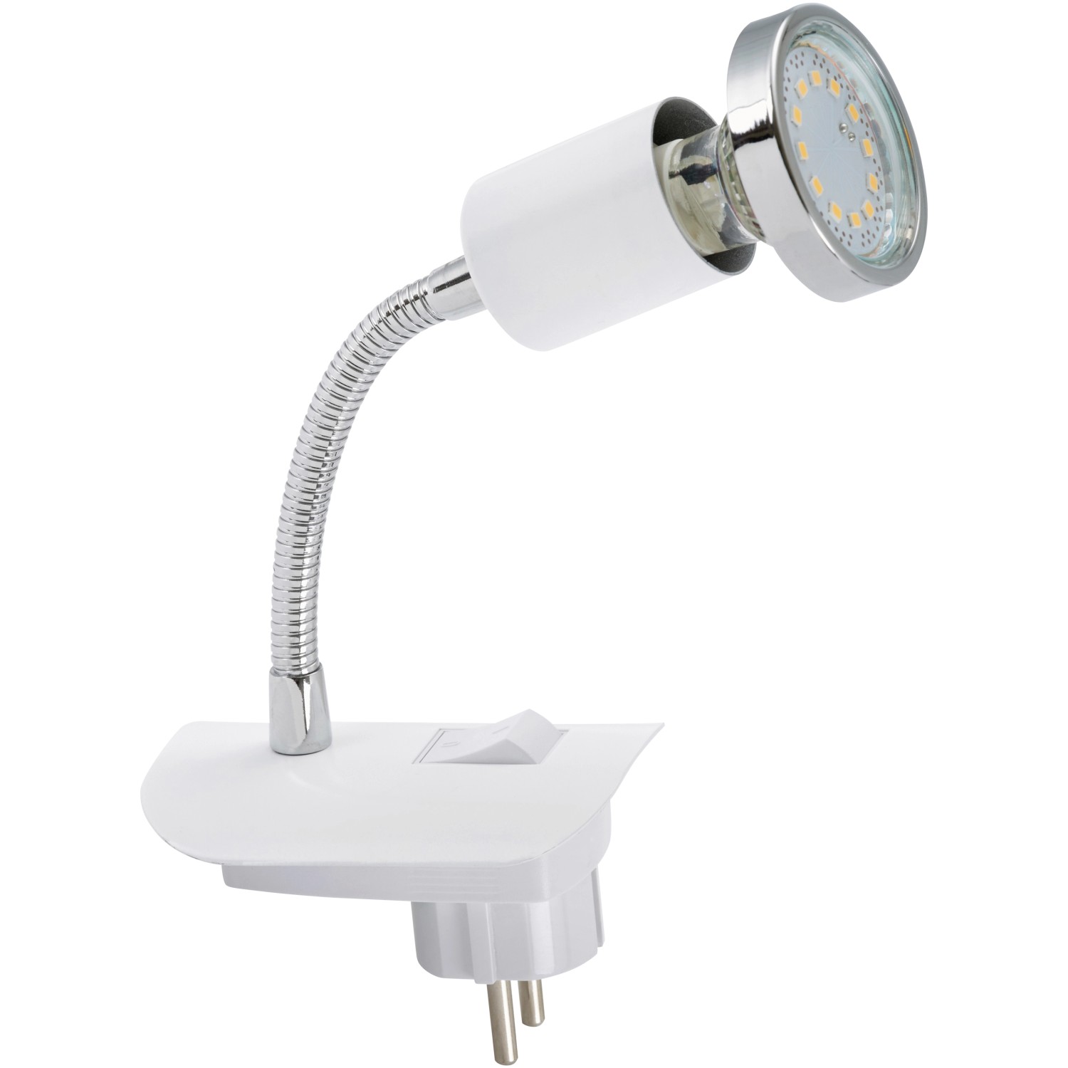 Mit dieser praktischen LED-Steckerleuchte setzen Sie gezielt moderne Akzente in Ihrem Zuhause. Die Leuchte überzeugt durch eine Kombination aus Metall sowie einem dreh- und schwenkbaren Leuchtkopf. Zudem ist die Leuchte mit einem Schalter ausgestattet. Im Lieferumfang ist ein LED GU10 3 Watt Leuchtmittel enthalten. Die LEDs haben eine lange Lebensdauer von 25.000 Stunden und strahlen in Warmweiß mit einer Farbtemperatur von 3.000 K.