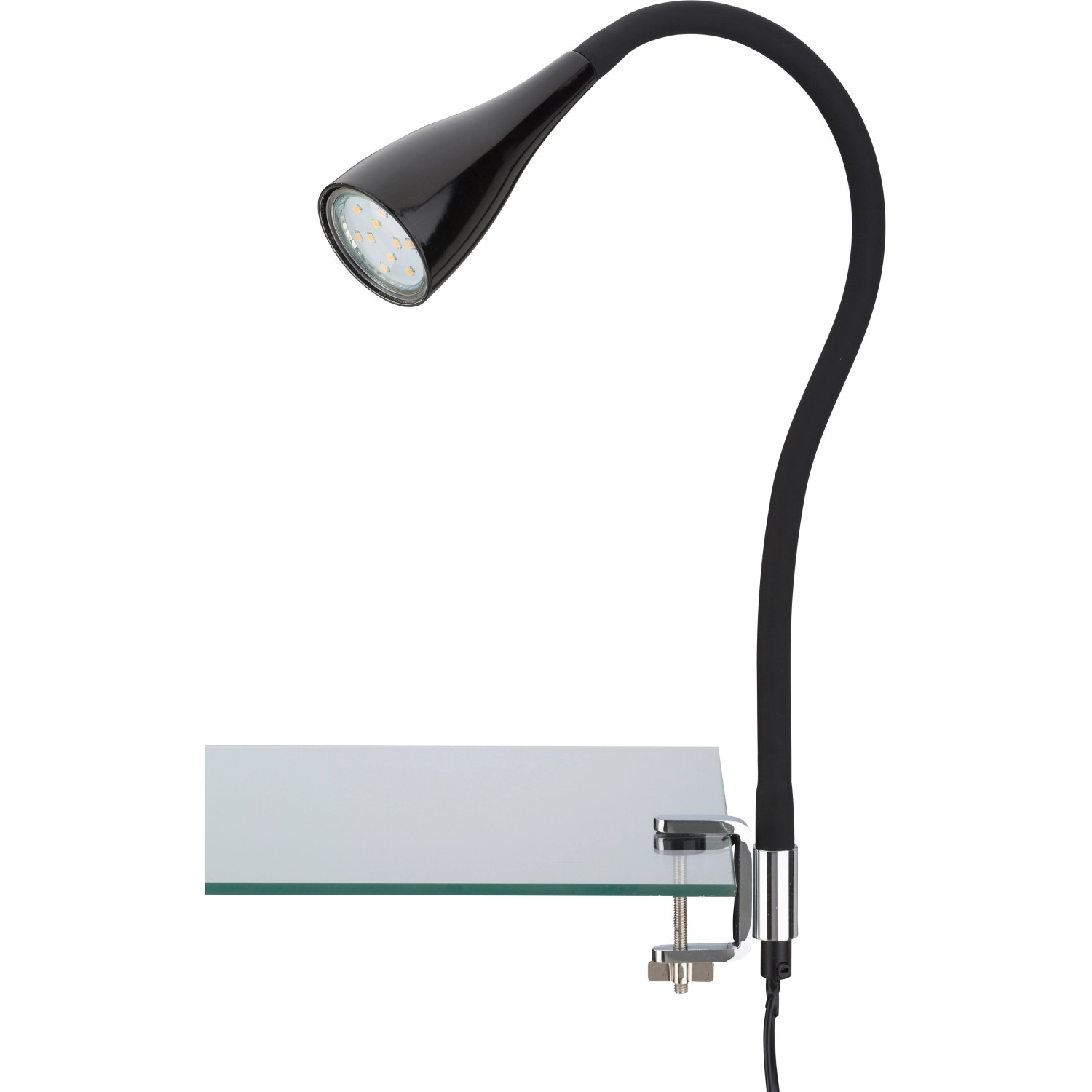 Mit dieser praktischen LED-Klemmleuchte setzen Sie gezielt moderne Akzente in Ihrem Zuhause. Die Leuchte überzeugt durch innovative LED-Technologie und einen individuell verstellbaren Flexarm. Zudem ist die Leuchte mit einem praktischen An-/Aus-Schalter und einer schwarzen Zuleitung ausgestattet. Die Leuchte wird inklusive einem LED-Leuchtmittel GU10 3 Watt geliefert. Die LEDs haben eine lange Lebensdauer von 25.000 Stunden und strahlen in Warmweiß mit einer Farbtemperatur von 3.000 K.