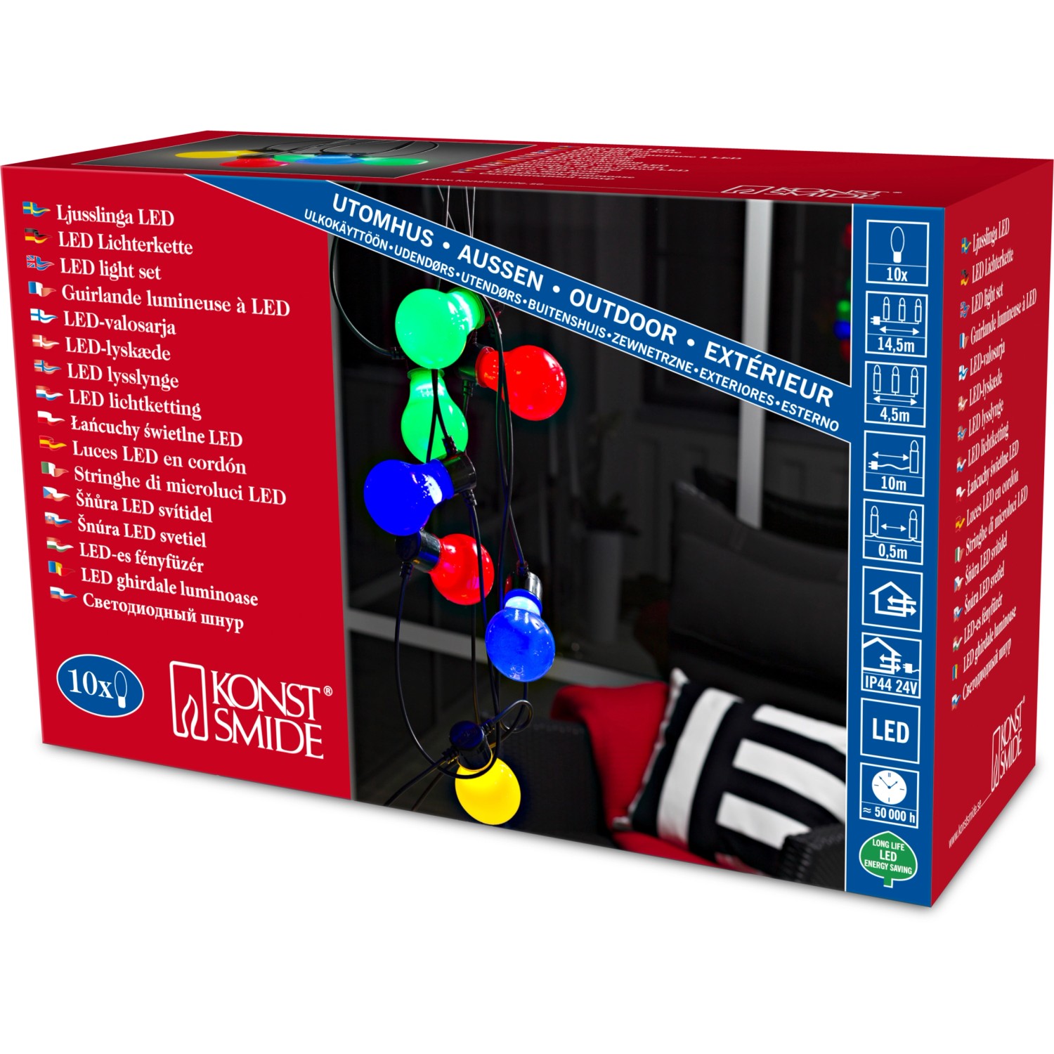 Die Konstsmide LED Biergartenkette besteht aus 10 opalfarbenen bunten Leuchtmittel und zaubert eine wunderschöne Beleuchtung bei Nacht. Mit einer beleuchteten Länge von 4,5 Metern hüllen Sie Ihren Garten oder Ihre Terrasse in eine wohltuende Lichtkulisse. Die schönen Lichtgestalten dieser Kette lassen Ihre Pergola, Baumkronen und Sträucher effektvoll in der Dunkelheit erstrahlen und illuminieren dadurch auch die Umgebung sanft. Dank moderner LED-Technik ist der Stromverbrauch minimal. Freuen Sie sich auf die perfekte Atmosphäre für ausgelassene Sommerfeste oder romantische Candlelight-Dinner. Mit einer Zuleitung von 10 Metern ersparen Sie sich ein zusätzliches Verlängerungskabel.