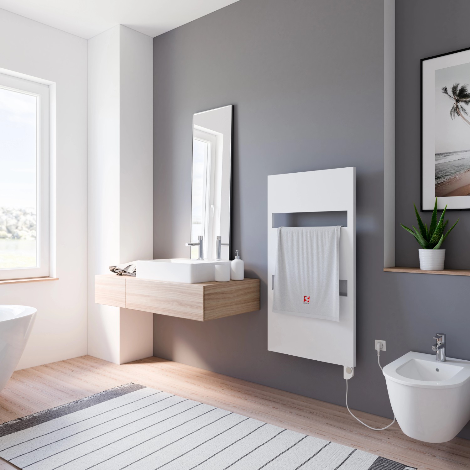 Dieser Design Heizkörper Turin der Marke Schulte begeistert mit seiner beinahe vollflächigen Front, welche durch einige Ausschnitte unterbrochen wird. In diesen Aussparungen können Handtücher optimal aufgehangen werden - egal, ob zum Trocknen nach oder zum Aufwärmen vor dem Gebrauch. Der Heizkörper wird inklusive Befüllung und Heizstab 3 des Herstellers geliefert und kann einfach an die Steckdose angeschlossen werden. Technische Daten Farbe: Alpinweiß, pulverbeschichtet Maße (H x B x T): 114,3 cm x 50,5 cm Inklusive Heizstab 3, 600 Watt und Befüllung Version rechts