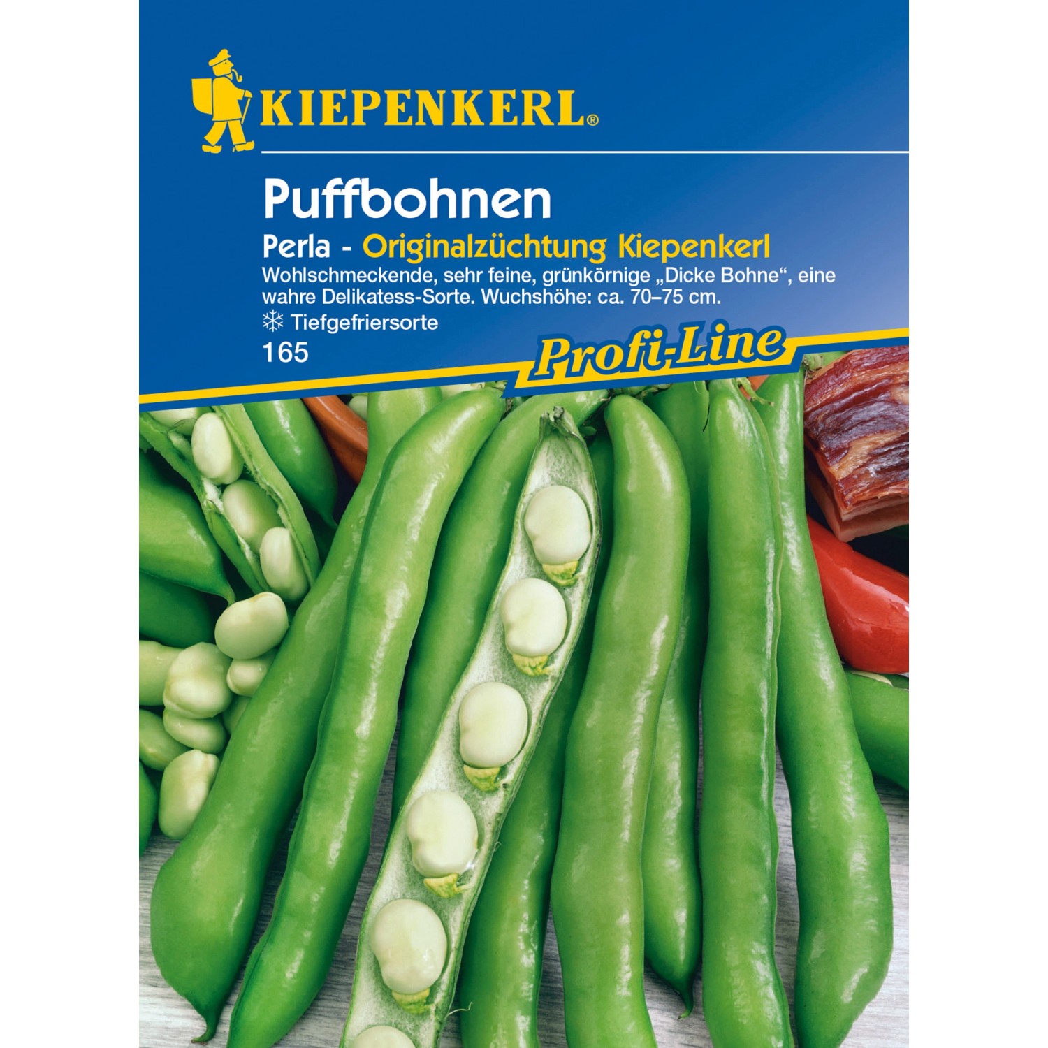 Die Kiepenkerl Puffbohne "Perla" (Vicia faba) ist die feinste, zurzeit auf dem Markt befindliche Delikatess-Sorte mit geraden Hülsen und rundlichen Körnern von tiefgrüner Farbe. Die feinkörnige "Perla" zeichnet sich durch einen sehr angenehmen, feinen Geschmack aus. Die standfesten Pflanzen sind mit einer Wuchshöhe von 70 cm bis 75 cm eher zierlich und dunkellaubig. Aus den reinweißen Blüten entwickeln sich 12 cm bis 14 cm lange, gerade, aufrecht stehende Hülsen. Sie sind gefüllt mit 5 bis 6 Körnern. "Perla" eignet sich ideal zum Einfrieren.