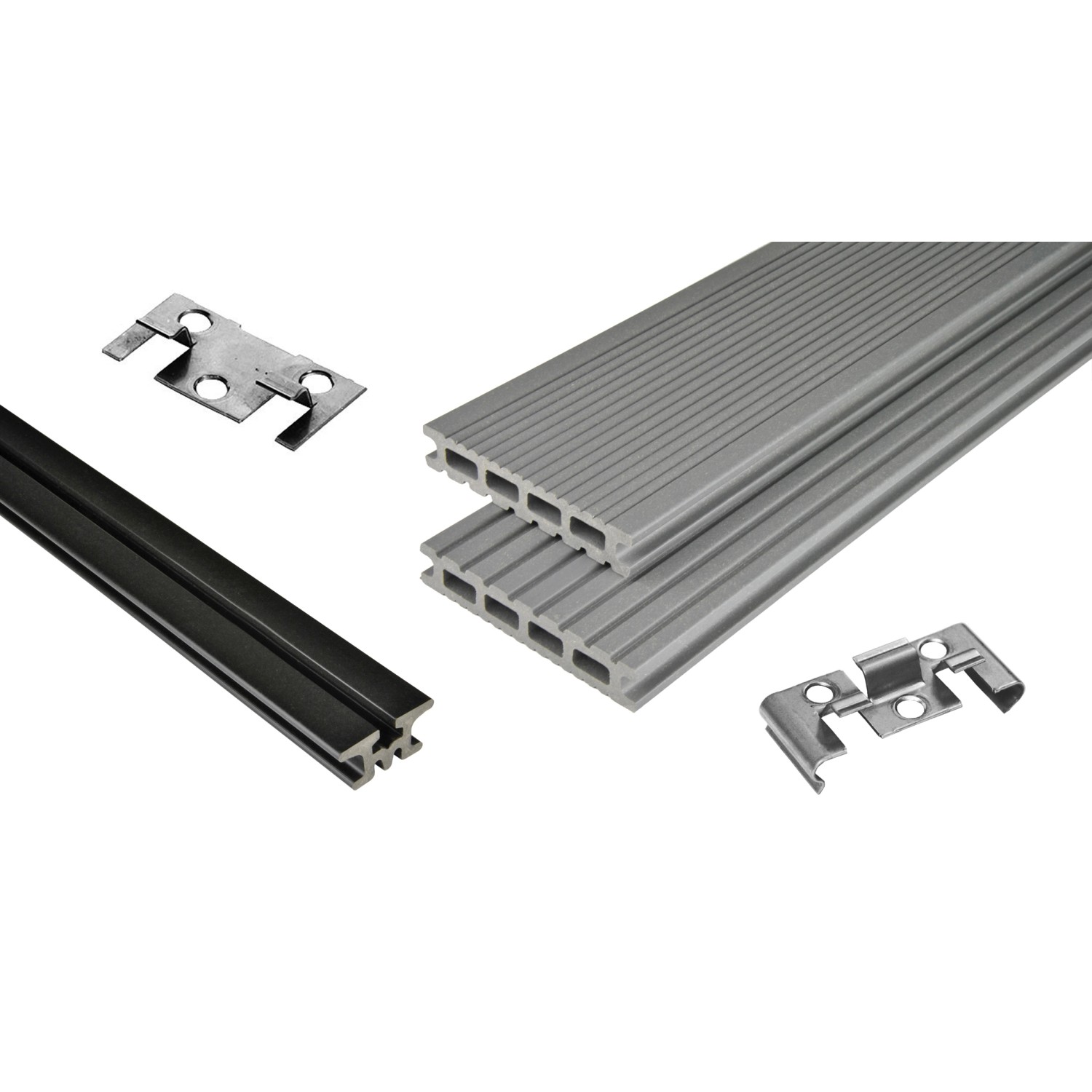 Der Terrassen-Bausatz Kovalex WPC Exklusiv mattiert Grau 300 cm x 500 cm besteht aus: