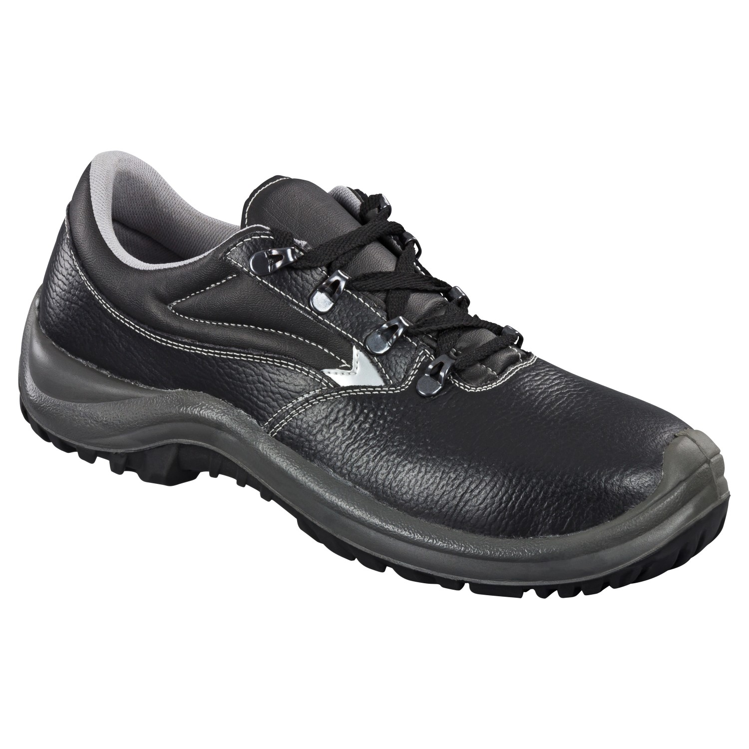 Der Sicherheitsschuh S3 ist aus Büffelleder gefertigt und entspricht der Schutzklasse S3. Er ist mit eine Stahlkappe, einer rostfreien Stahlzwischensohle und einer Überkappe ausgestattet. Reflektor-Elemente, eine gepolsterte Zunge mit Staubschutz, sowie eine leichte Duo-PU/PU-Sohle mit hervorragenden Dämpfungseigenschaften (Shock Absorber) sind ebenfalls vorhanden. Die Schuhsohle ist optimal rutschhemmend nach SRC-Norm. Ein reißfestes, atmungsaktives Innenfutter mit anatomischen Fußbett sorgt für den nötigen Laufkomfort. Der Schuh ist öl- und benzinabweisend sowie antistatisch. Farbe: Schwarz Größe: 46