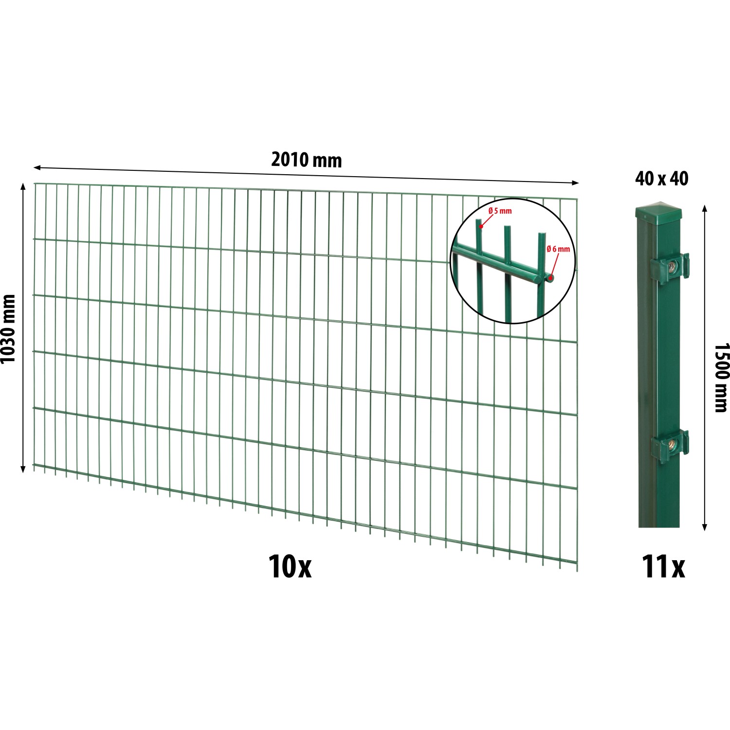 Das Floraworld Doppelstabmatten-Zaunset mit Pfosten 4 x 4 cm Grün 103 x 2000 cm besteht aus 10 grün pulverbeschichteten Doppelstabmatten (Einzelmaß 200 cm x 103 cm) sowie 11 Vierkant-Zaunpfosten (Einzelmaß 4 cm x 4 cm x 150 cm). Das Set ist einfach zu montieren und aus UV- und wetterbeständigem Material gefertigt. Gesamtlänge 20 Meter, Zaunhöhe 103 cm. Die Maschenweite der Matten beläuft sich auf 50 mm x 200 mm. Die vertikalen Stäbe haben eine Stärke von 6 mm, die horizontalen Stäbe eine Stärke von 5 mm.