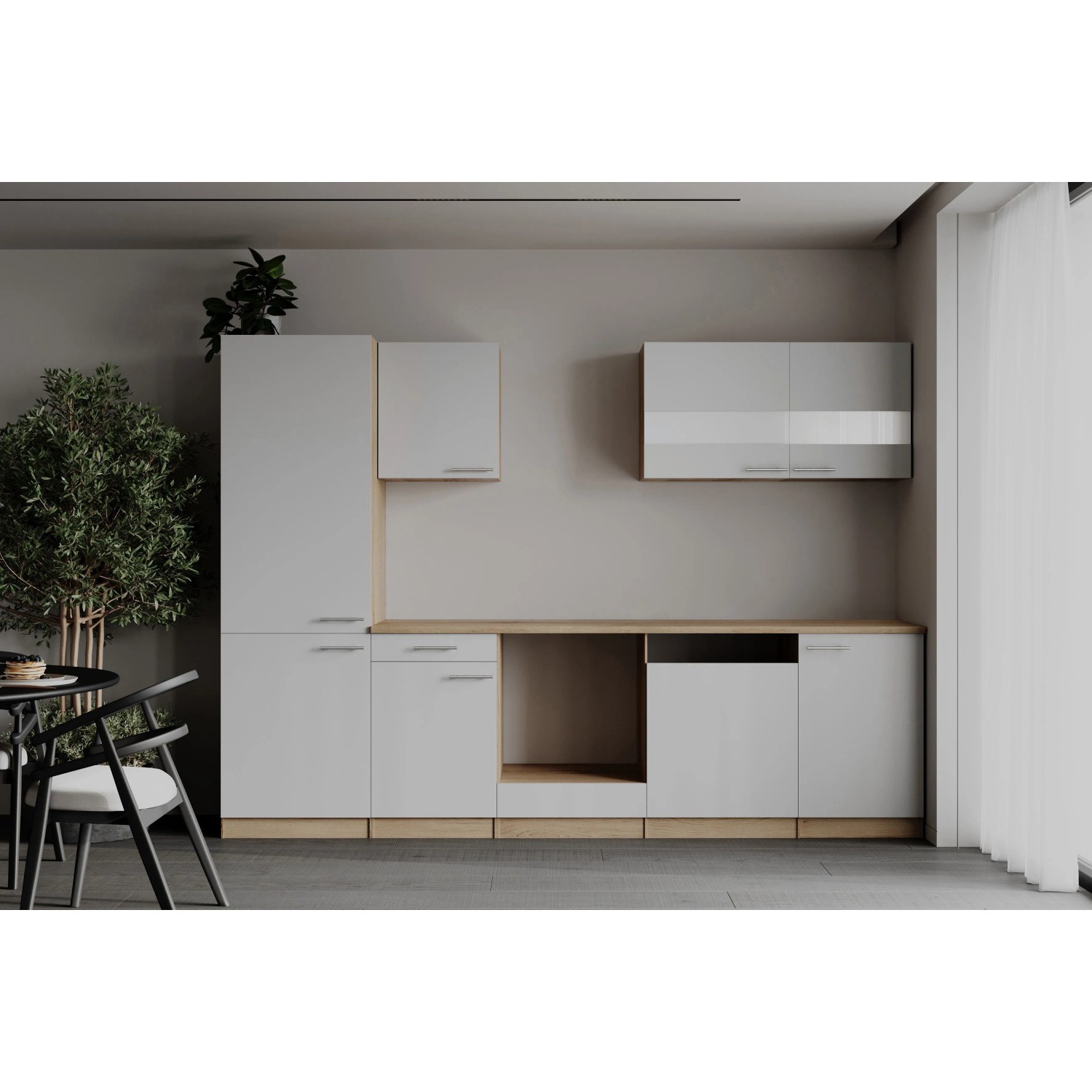 Die Küche bietet großzügigen Stauraum und ist dank wechselseitig aufbaubarer Elemente flexibel planbar. Hochwertige Details wie Soft-Close-Auszüge und -Scharniere sowie eine komfortable Arbeitshöhe von 85 cm sorgen für optimalen Bedienkomfort.