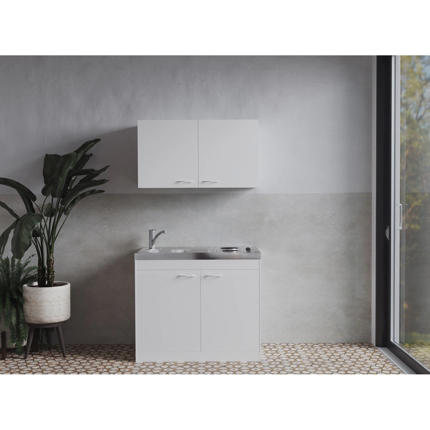 Kompakte Komplettlösung: Miniküche mit Oberschrank auf nur 100 cm Breite für kleine Räume