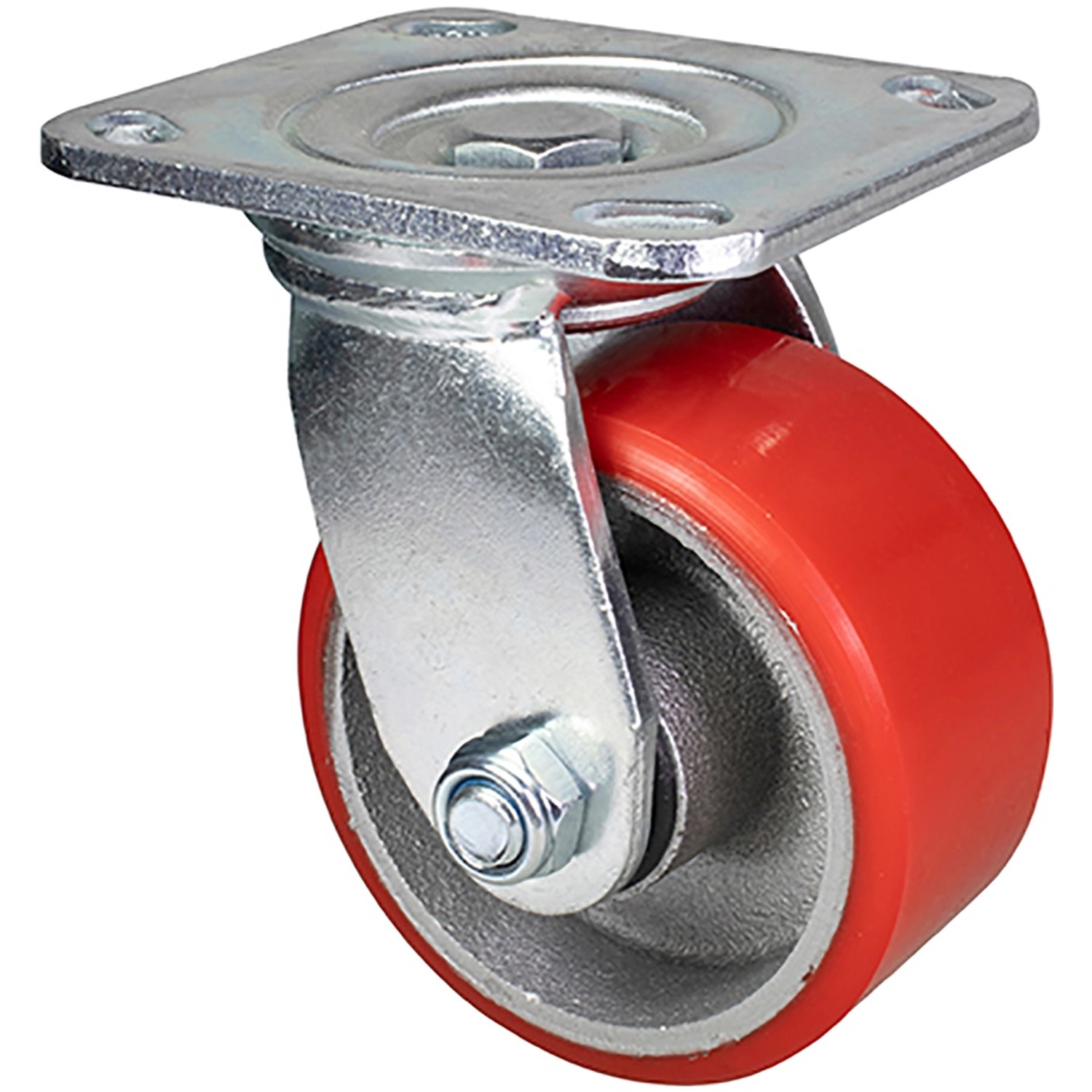 Das Gehäuse und die Anschraubplatte der Schwerlast-Lenkrolle sind aus massivem Industriestahl gefertigt. Der Radkörper besteht aus massivem Gusseisen. Die Lauffläche des Rades ist mit bodenschonendem, abriebfestem und hoch temperaturbeständigem Polyurethan (PUR) pannensicher ummantelt.
