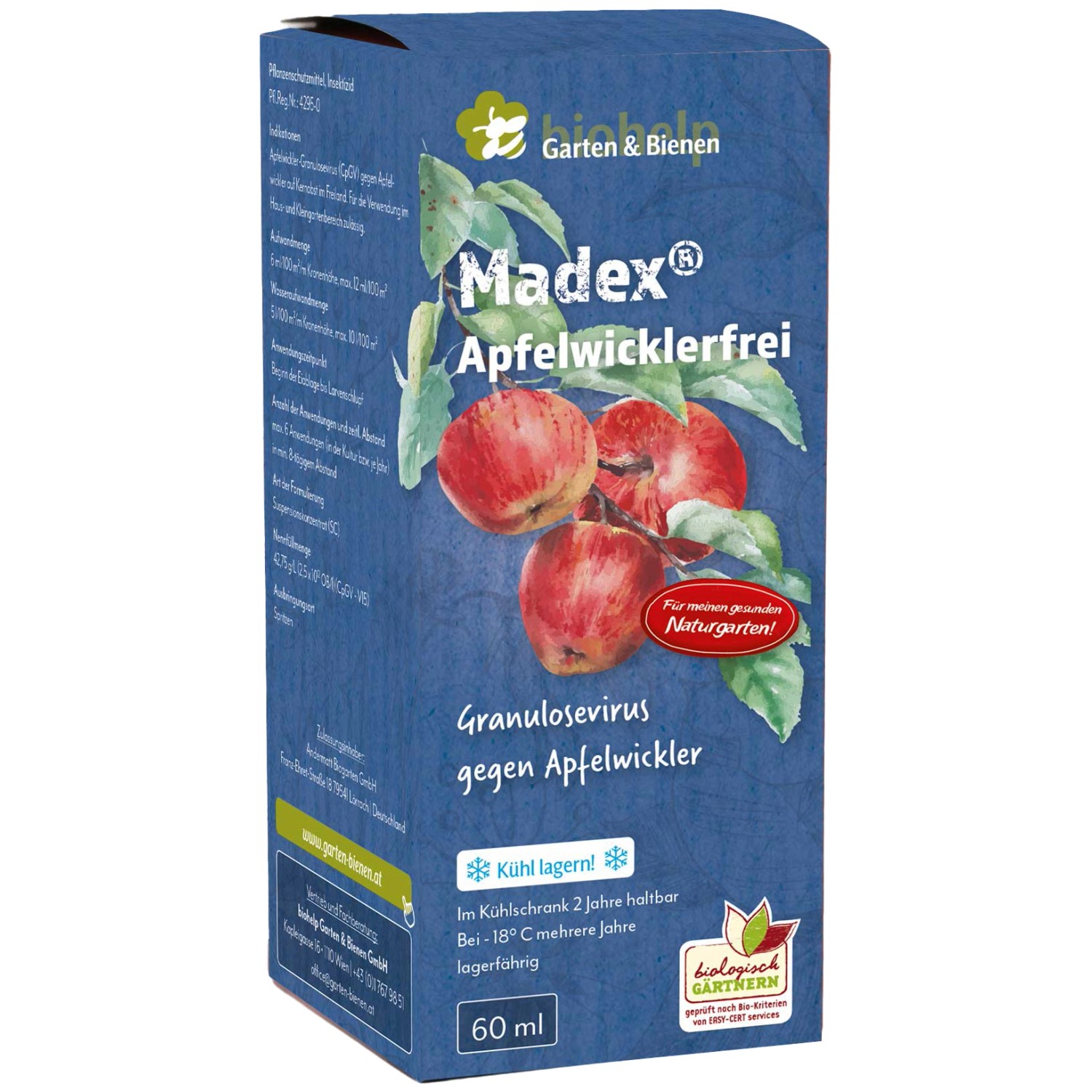 Der biohelp Granulosevirus gegen Apfelwicklerlarven (Inhalt) 60 ml wird verdünnt auf Stamm und Krone der Apfelbäume aufgetragen. Vorhandene Apfelwicklerraupen infizieren sich mit dem Krankheitserreger und sterben in Folge ab. Die Anwendung von Madex führt zu einer deutlichen Befallsminderung im Folgejahr. Der Granulosevirus wirkt hochspezifisch, d.h. es werden nur die Larven des Apfelwicklers beeinträchtigt. Keine Auswirkungen auf andere Organismen wie Bienen etc.