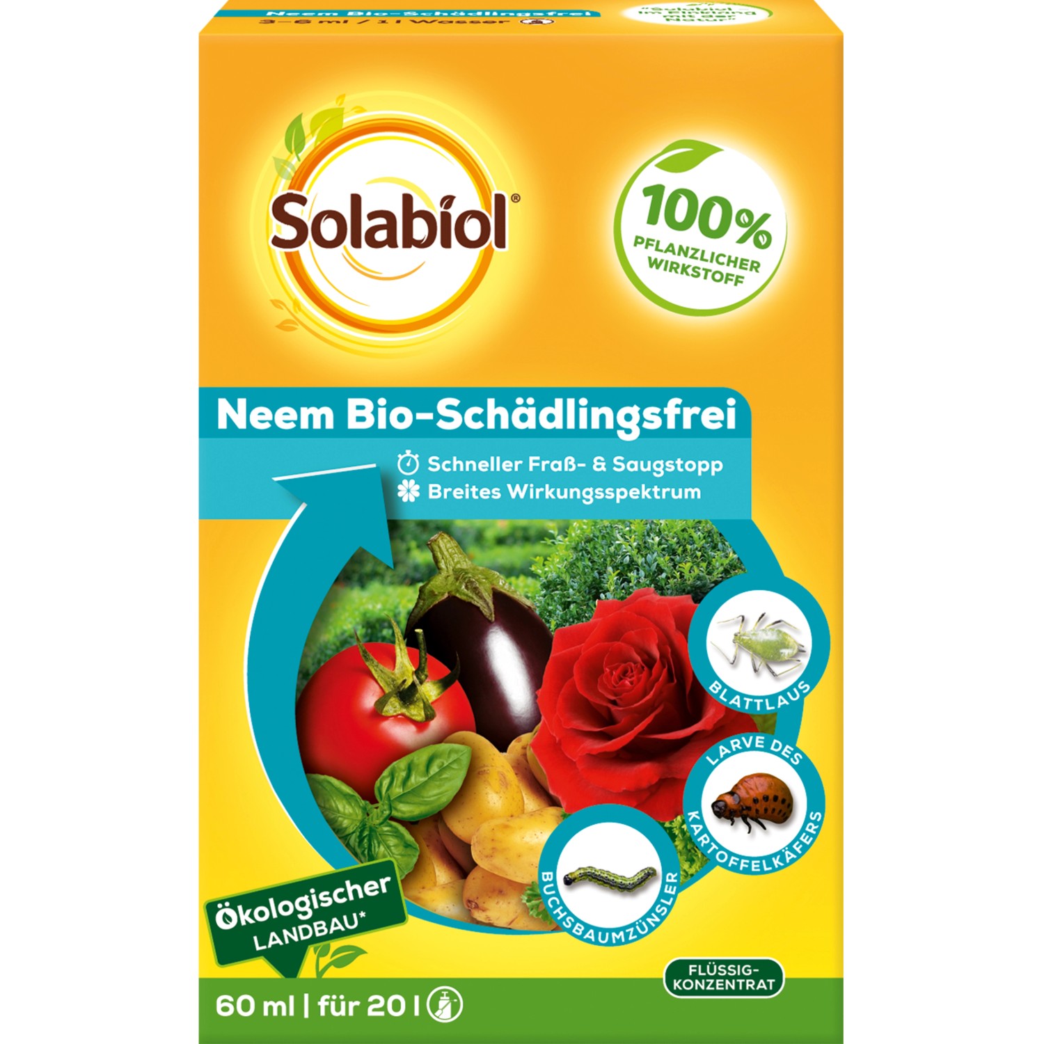 Das Solabiol Neem Schädlingsfrei 60 ml ist ein Mittel gegen saugende und beißende Schädlinge (einschließlich Buchsbaumzünsler und Kartoffelkäfer) an Zierpflanzen, frischen Kräutern, Kartoffeln und Gemüse. Spinnmilben werden in den festgesetzten Anwendungsgebieten miterfasst. Zudem ist es gegen Trauermücken-Larven (Gießanwendung) im Gewächshaus zugelassen. 60 ml reichen dabei für 20 l Spritzbrühe.