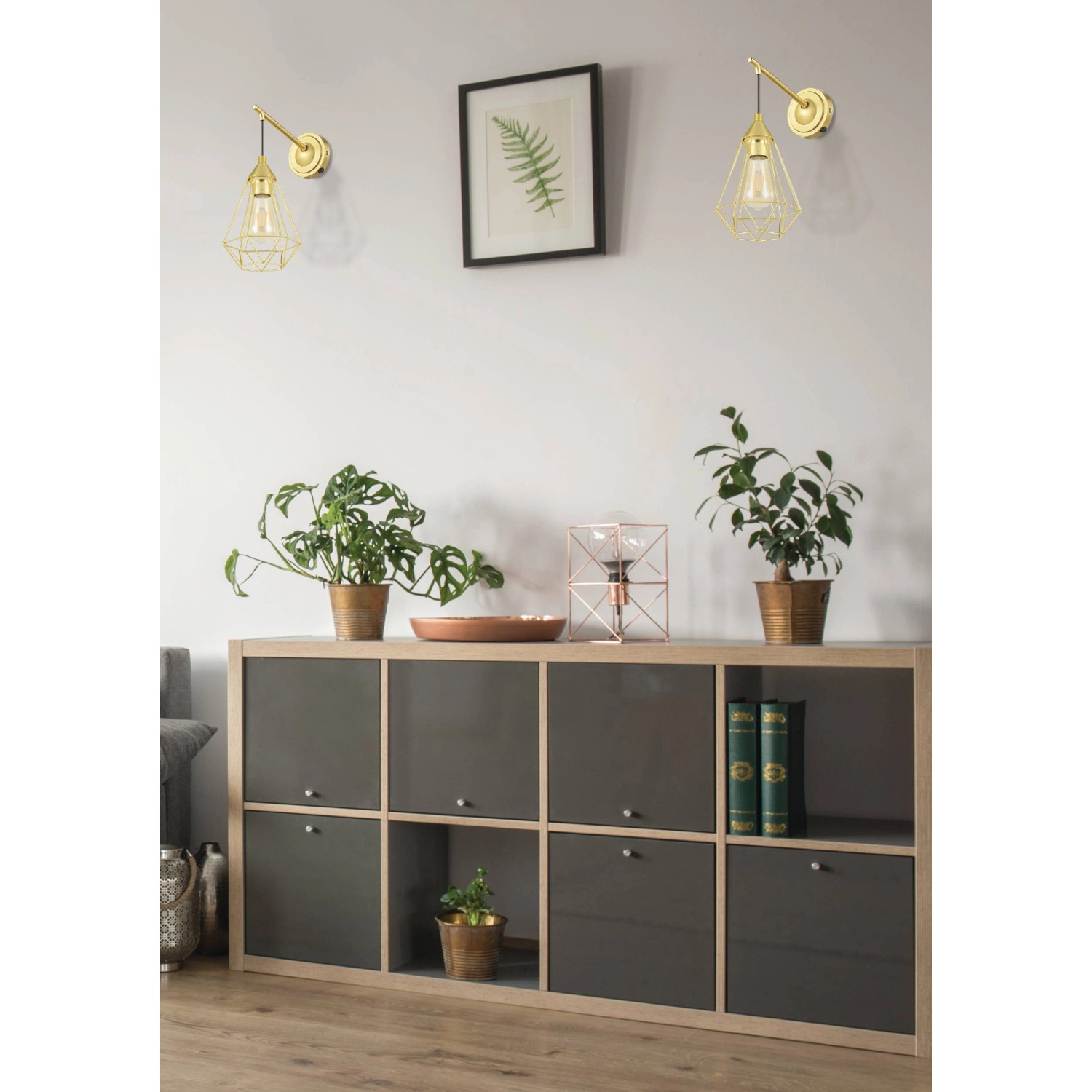 Die Wandleuchte Tarbes ist aus einer runden Metall-Aufhängung in Messing-Gebürstet mit einem gleichfarbigen, länglichen Leuchtenarm gefertigt. Kombiniert wurde dieser mit einem abgehängten Draht-Schirm in filigraner Diamant-Form. Durch den geometrischen Schirm entstehen im eingeschalteten Zustand faszinierende Licht- und Schattenspiele. Die moderne Wandlampe bietet eine stilvolle Beleuchtung für jeden Raum - egal ob in der Küche, im Wohnzimmer, Schlafzimmer, Flur oder Esszimmer. Das abgebildete Filament-Leuchtmittel ist nicht im Lieferumfang enthalten. Geeignet ist die Leuchte für jedes Leuchtmittel mit E27-Sockel.