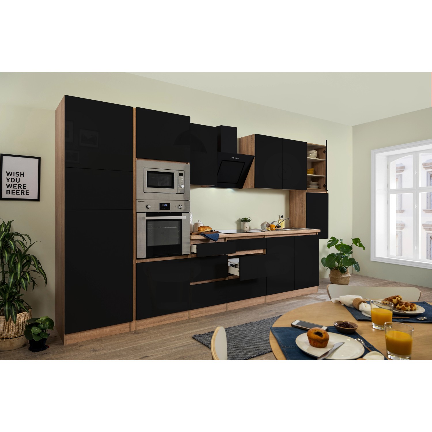 Respekta Premium Küchenzeile Grifflos 385 cm Schwarz Hochglanz-Eiche Sägerau