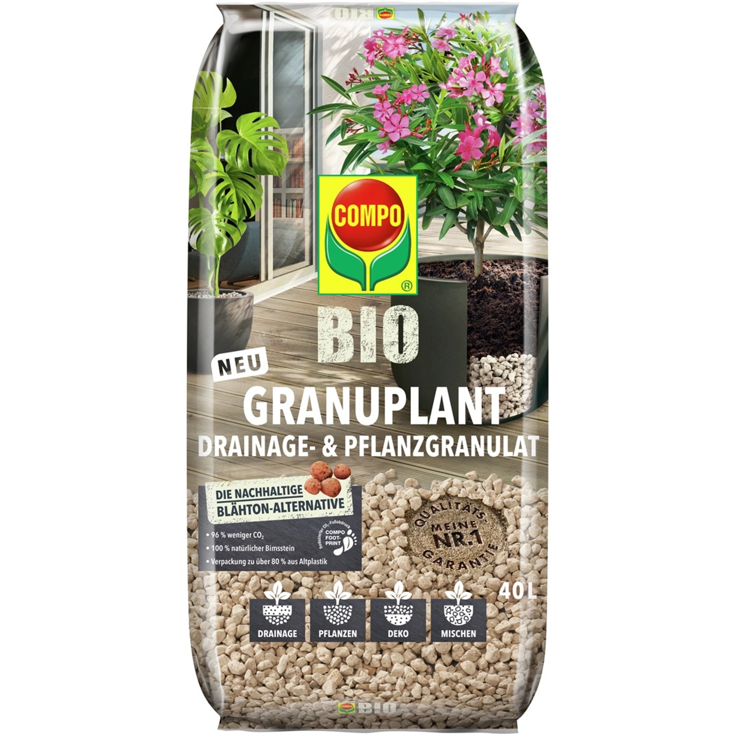 Das Compo Granuplant® Drainage- und Pflanzgranulat ist die ideale Alternative zum herkömmlichen Blähton. Das Granuplant® Drainage- und Pflanzgranulat eignet sich hervorragend als Drainageschicht in jedem Pflanzgefäß und schützt Pflanzen so vor Staunässe und Wurzelfäule. Es ist außerdem das perfekte Pflanzmedium für Hydro- und Semikulturen. Darüber hinaus sorgt es für eine optimale Bodenbelüftung und leitet Wasser sehr effektiv kapillar an die Wurzeln. Durch Untermischen des Bimsgranulats wird die Erde aufgelockert und schützt vor Verdichtung. Die optisch ansprechende Erdabdeckung von Pflanzgefäßen verhindert das Austrocknen der Erde.