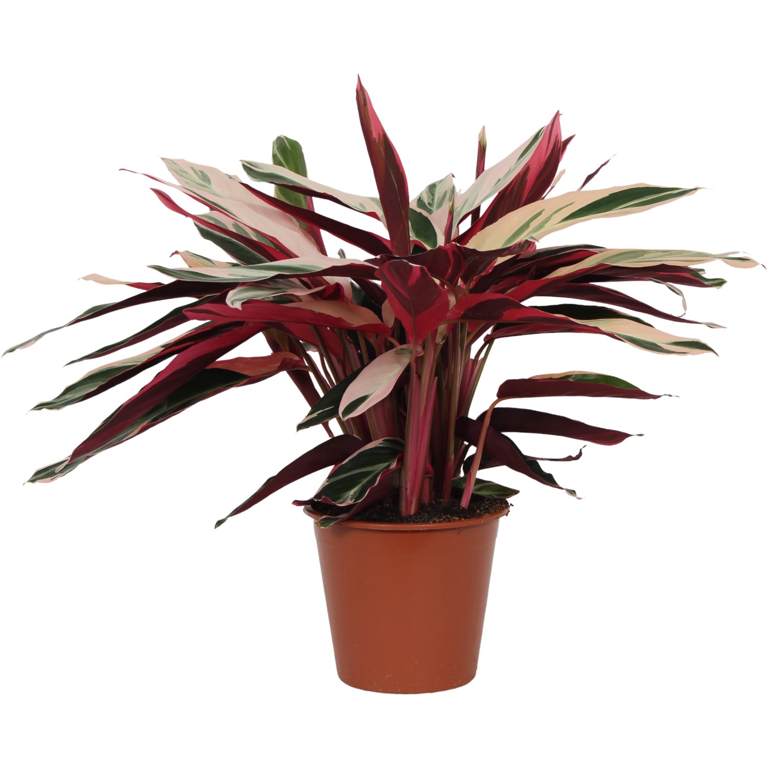 Die Korbmarante "Triostar" (Calathea Stromanthe sanguinea) ist eine tropische Blattschmuckpflanze. Ihre auffallend schöne Blattzeichnung und längliche Form der Blätter machen die Korbmarante zu einer außergewöhnlichen Zimmerpflanze. Bei guter Pflege bildet sie gelbe, röhrenförmige Blüten, die in schönen Ähren angeordnet sind. Wenn es dunkel wird, rollen sich die Blattränder der Pflanze nach innen. Sie mag halbschattige Standorte ohne direkte Sonneneinstrahlung. Temperaturen zwischen 20°C und 25°C sind ideal. Auch regelmäßiges Gießen ist wichtig, sodass die Erde stets feucht bleibt. Im Sommer, bei höheren Temperaturen, zusätzlich mit Wasser besprühen, da die Korbmarante hohe Luftfeuchtigkeit mag. Über die Winterzeit sollten 15°C nicht dauerhaft unterschritten werden. Ballentrockenheit und Staunässe vermeiden. Alle zwei Wochen düngen.
