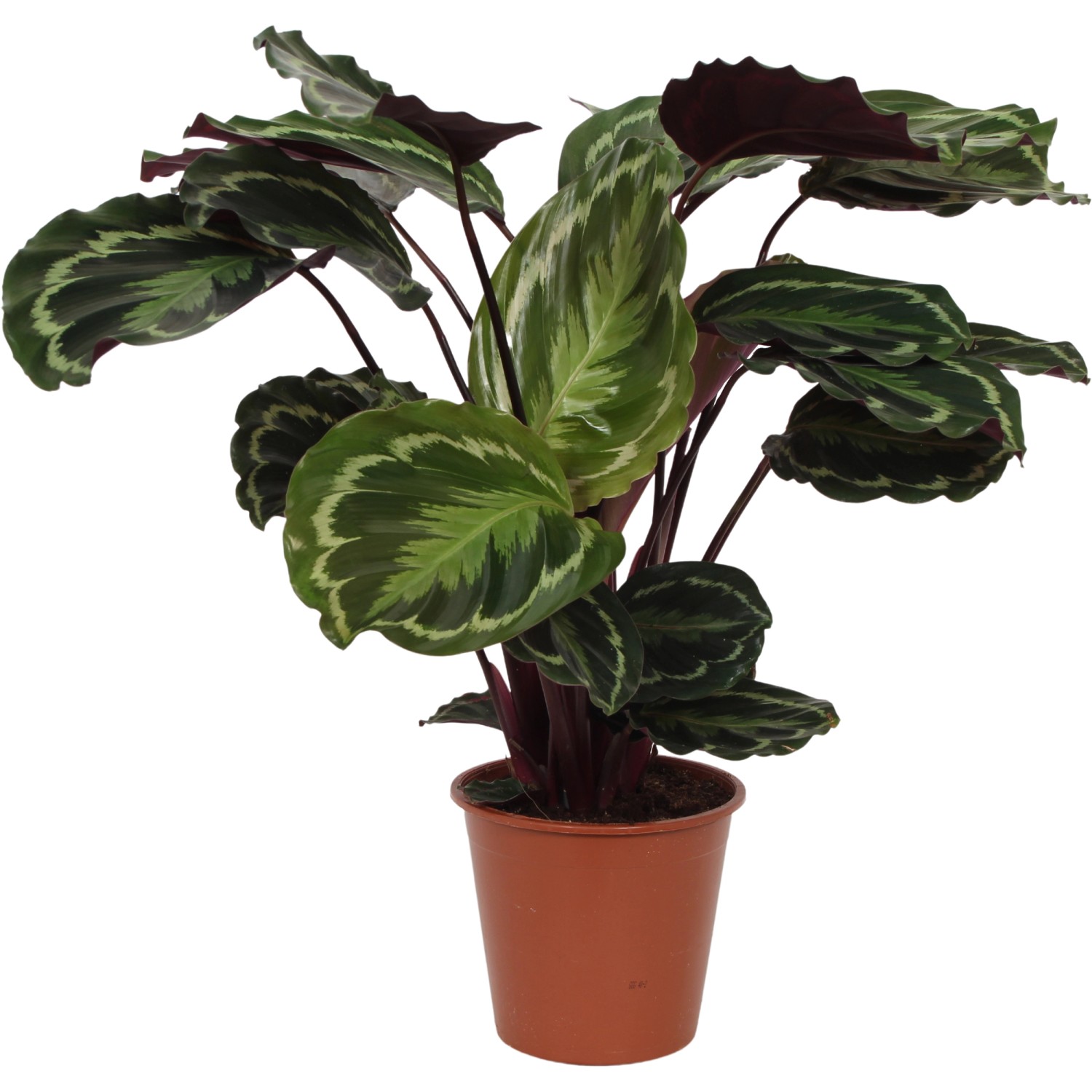 Die Korbmarante "Medallion"(Calathea roseopicta) ist eine tropische Blattschmuckpflanze. Die Sorte "Medallion" verfügt über eine faszinierende Blattzeichnung die Blattunterseiten sind weinrot bis violett. Ihre auffallend schönen Blätter macht diese Korbmarante zu einer außergewöhnlichen Zimmerpflanze. Wenn es dunkel wird, rollen sich die Blattränder der Pflanze nach innen. Sie mag halbschattige Standorte ohne direkte Sonneneinstrahlung. Temperaturen zwischen 20°C und 25°C sind ideal. Auch regelmäßiges Gießen ist wichtig, sodass die Erde stets feucht bleibt. Im Sommer, bei höheren Temperaturen, zusätzlich mit Wasser besprühen, da die Korbmarante hohe Luftfeuchtigkeit mag. Über die Winterzeit sollten 15°C nicht dauerhaft unterschritten werden. Ballentrockenheit und Staunässe vermeiden. Alle zwei Wochen düngen.
