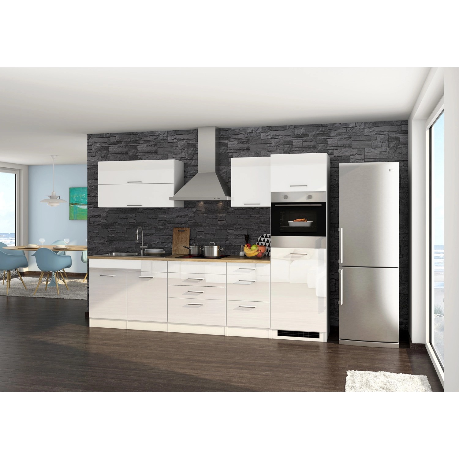 Held Möbel Küchenzeile Mailand 290 cm Weiß Hochglanz-Weiß Matt mit E-Geräten