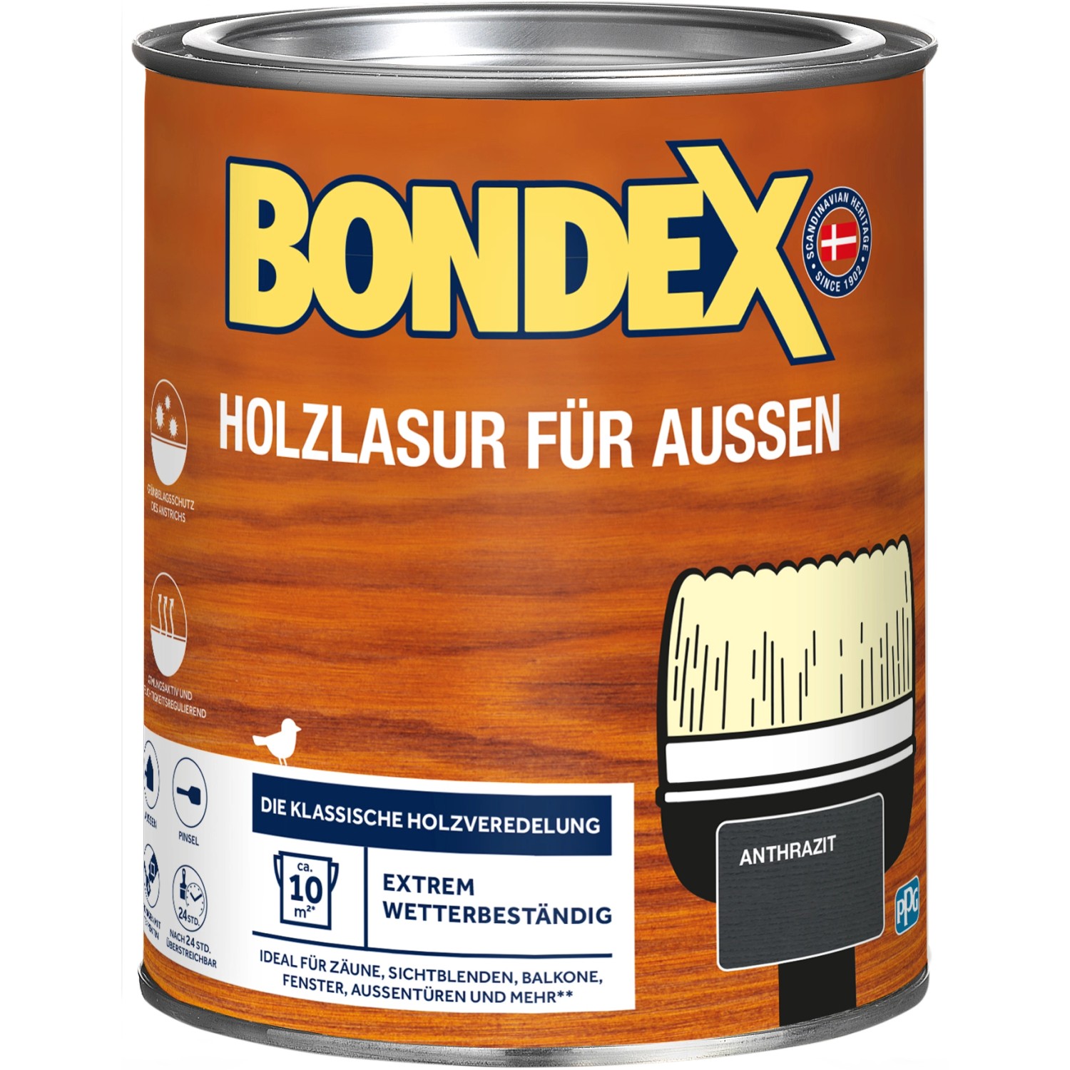 Die Holzschutzlasur von Bondex schützt und pflegt neue und alte Hölzer im Außenbereich. Sie macht das Holz wetterfest und wasserabweisend. Dabei hebt die Lasur die Maserung dekorativ hervor und gibt der Oberfläche einen frischen Glanz.