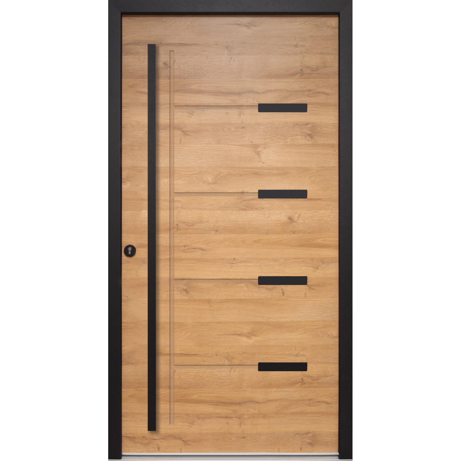 Die Splendoor Haustür ThermoSpace Oslo Prime Woodeffect vereint ein ansprechendes, modernes Design mit einer hochwertigen Verarbeitung in all ihren Bauelementen. Die Türoberfläche ist mit einer Eiche-natur-Dekorfolie vor Witterung geschützt. Ihre gleichmäßige Färbung setzt in Kombination mit den schwarzen Blendrahmen, der Glasapplikation und der schwarzen Stoßgriff-/Drückergarnitur gezielte Kontraste für ein hochwertiges Aussehen.