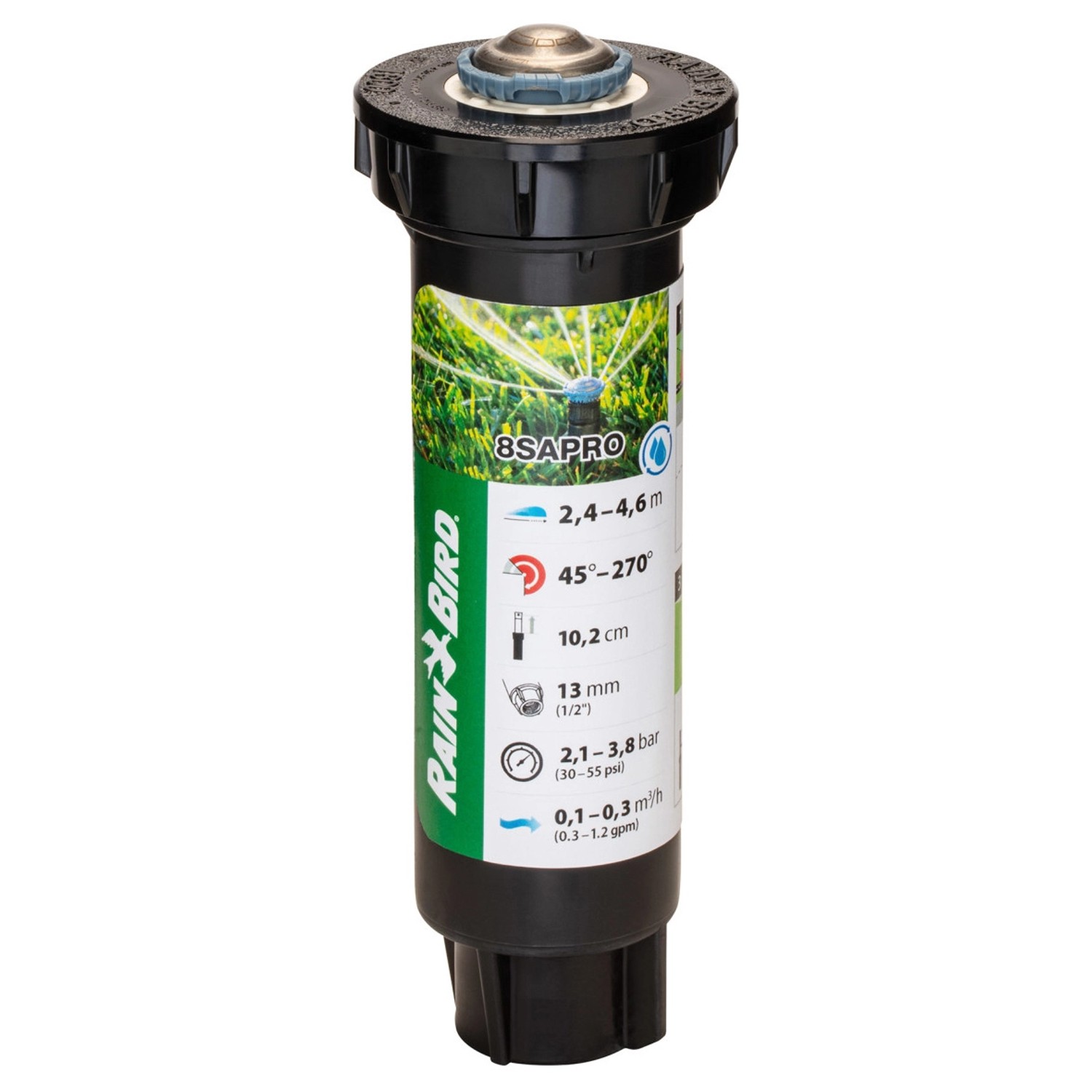 Dank der patentierten und druckaktivierten Abstreifdichtung wird unnötiger Wasseraustritt vermieden, was die Lebensdauer des Sprühers verlängert. Die hocheffiziente Rotationsdüse erzeugt dickere Wasserstrahlen mit großen Tropfen, die auch starken Winden widerstehen. Die Sprühweite erstreckt sich von 2,4 m bis 4,6 m.