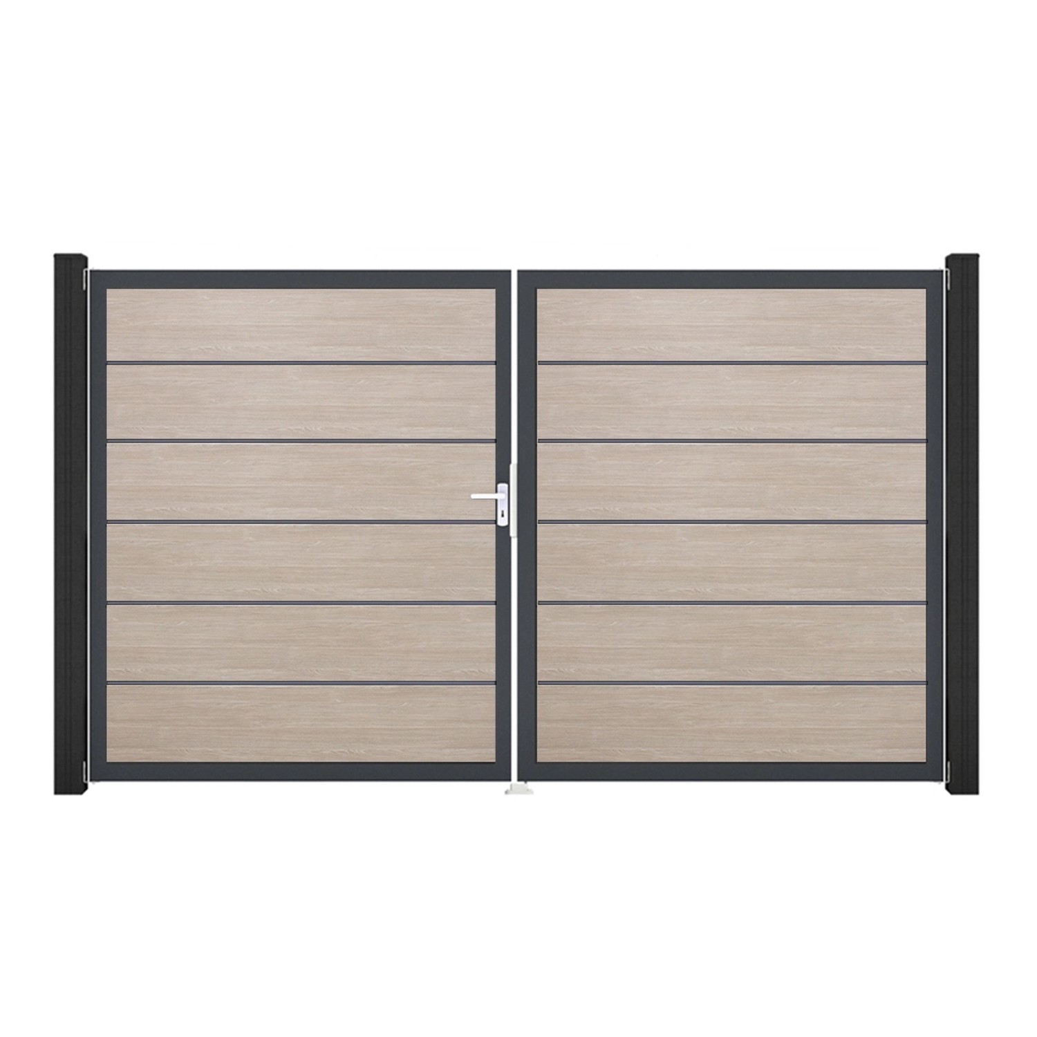 Die Zaunelemente werden mit größter Sorgfalt in eigener Produktion aus langlebigem PVC (Kunststoff) gefertigt, damit Sie lange Freude an Ihrem Sichtschutz haben.Dieses 2-flügelige Tor ist in der Ausführung DIN Links erhältlich und verfügt über einen umlaufenden Rahmen aus rostfreiem Aluminium, was für besondere Stabilität sorgt.