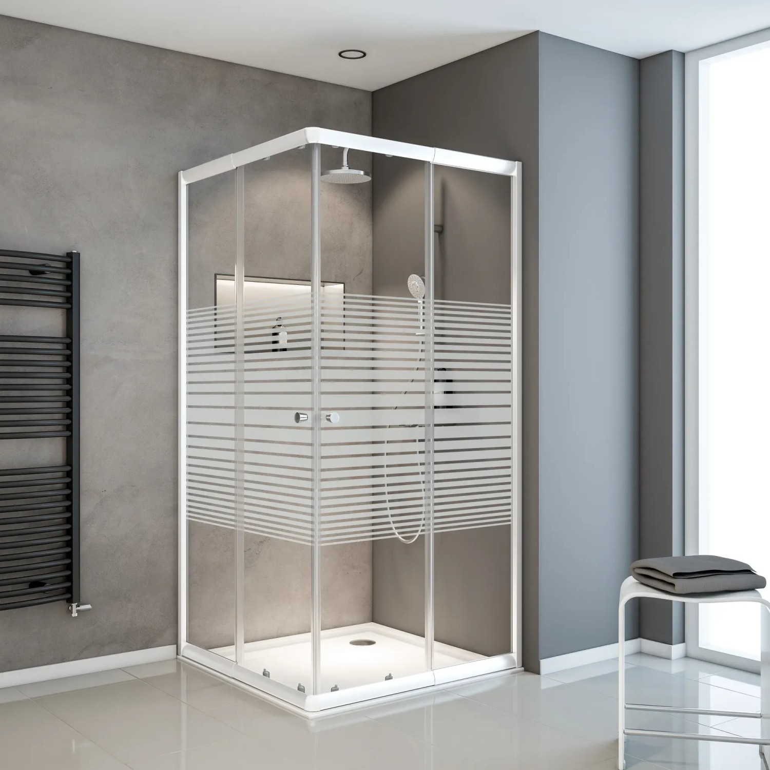 Die Duschabtrennung ist mit markanten, Aluminiumprofile in Alpinweiß ausgestattet, die nicht nur für eine zuverlässige Dichtigkeit gegen Spritzwasser sorgen, sondern auch ein ruhiges Laufverhalten gewährleisten. Die Flexibilität des vierteiligen Eckeinstiegs mit Schiebetüren ermöglicht es, die Profile je nach Einbausituation individuell anzupassen. Durch einfaches Auseinanderziehen oder Zusammenführen der Aluminiumprofile kann die Duschabtrennung Ihren Bedürfnissen angepasst werden.