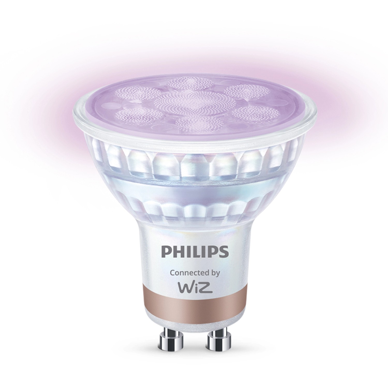 Das Philips WIZ GU10 Leuchtmittel strahlt mit einstellbarem, farbigem und warm- bis tageslichtweißem Licht und ist somit vielseitig einsetzbar.