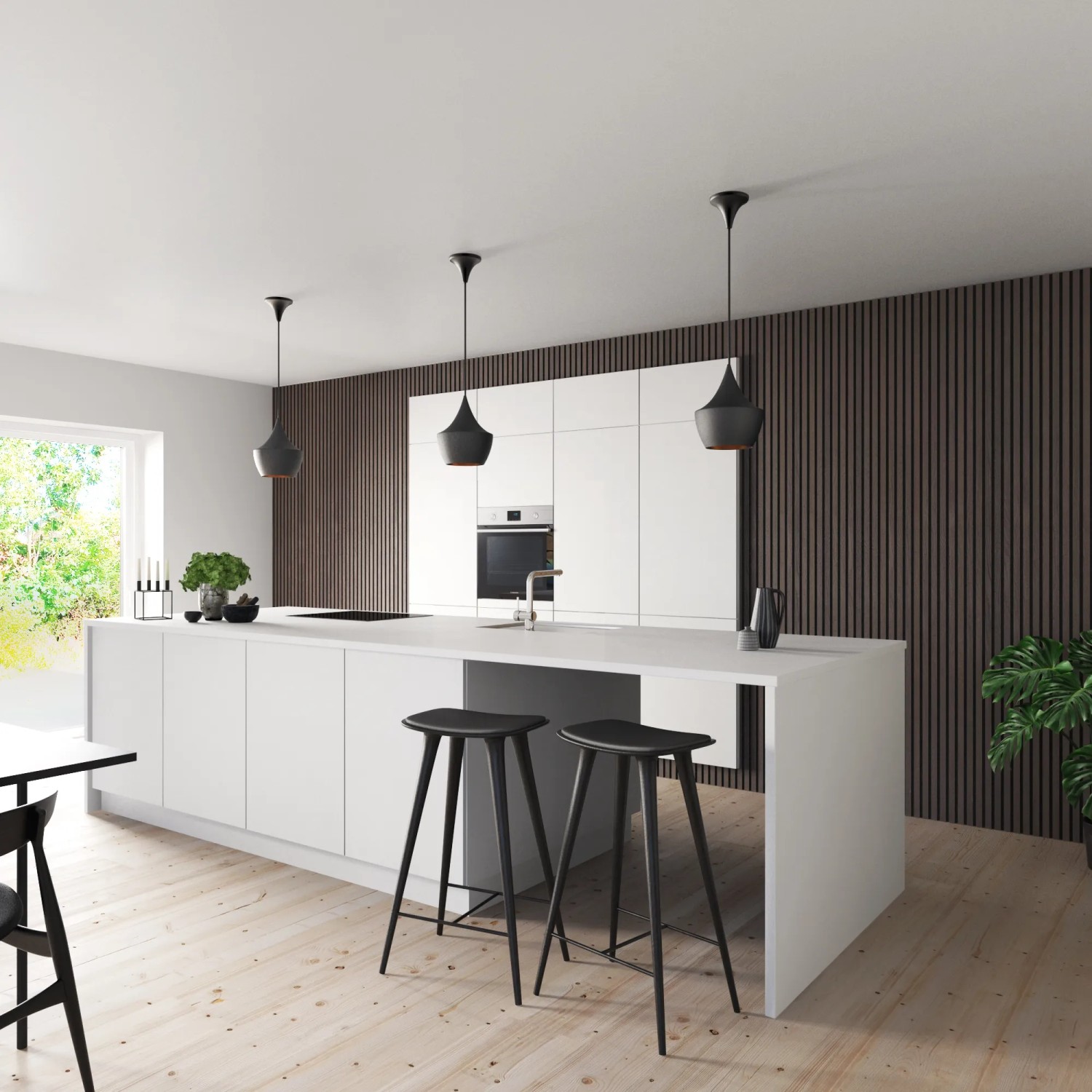 Die Akustikplatten lassen den Raum dank ihres Holzlooks tiefer und größer wirken. Kombinieren Sie verschiedene Formen und Proportionen von Akustikpaneelen, um einzigartige Muster und Designs an Wänden und Decken zu gestalten. Die Oberflächen aus echtem Holzfurnier unterstützen den skandinavischen Stil des Panels.