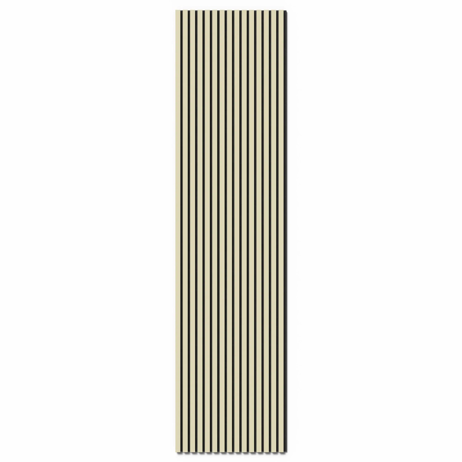 Die Akustikplatten lassen den Raum dank ihrer Streifenoptik tiefer und größer wirken. Kombinieren Sie verschiedene Formen und Proportionen von Akustikpaneelen, um einzigartige Muster und Designs an Wänden und Decken zu schaffen. Die Oberflächen in Linoleum unterstützen den skandinavischen Stil des Panels.