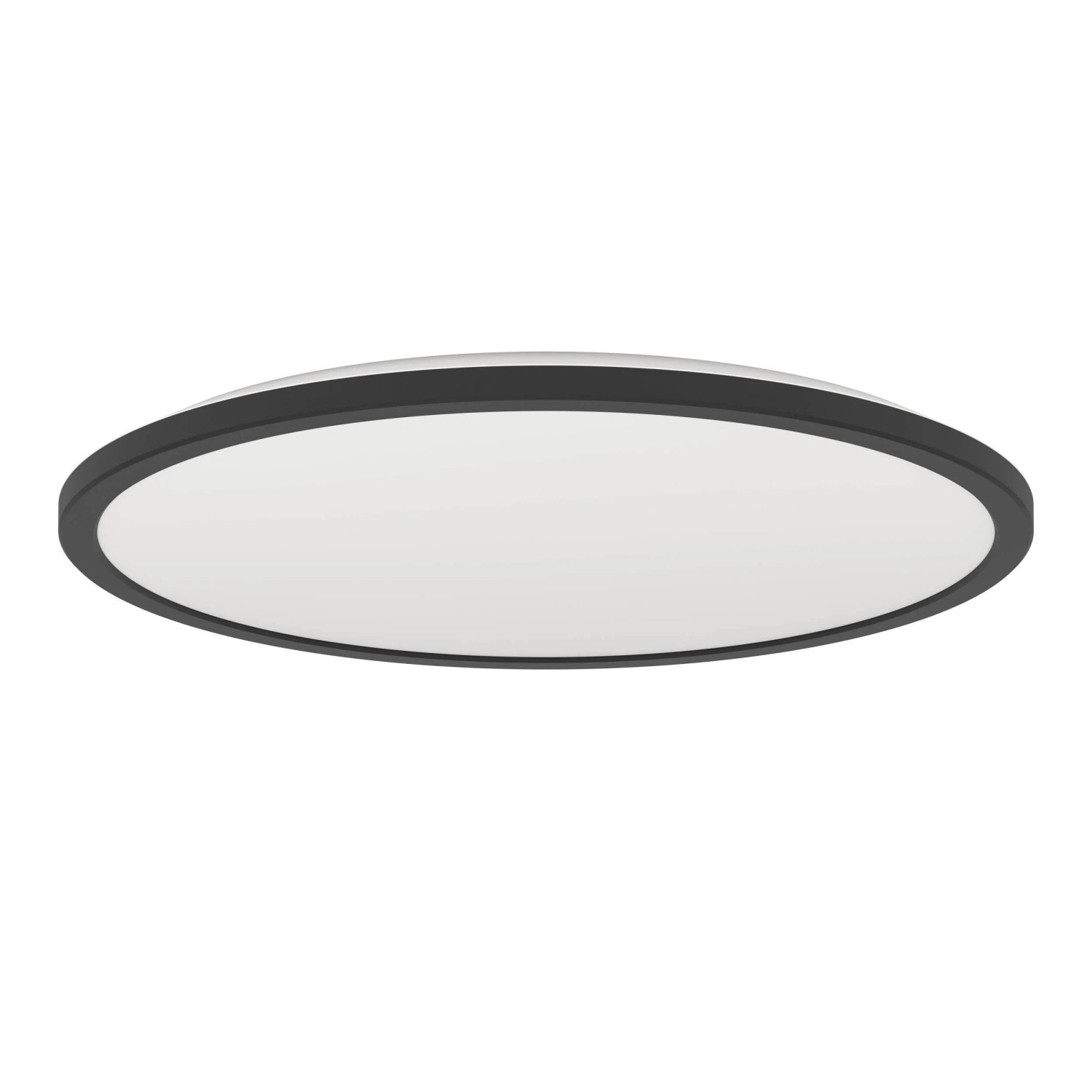 Die LED-Deckenleuchte Rovito-Z aus dem Smart Home Sortiment connect.Z mit einem Durchmesser von 50 cm besteht aus einem runden, schwarzen Kunststoff-Rahmen und einer Leuchtfläche aus weißem Kunststoff.