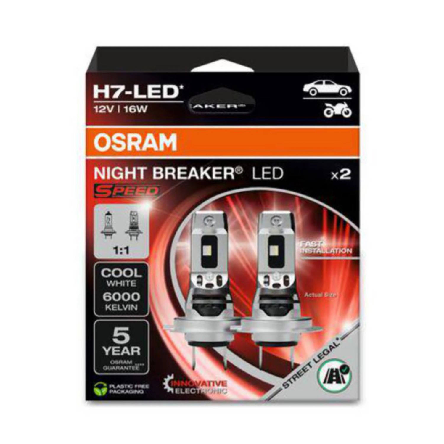 Die neue straßenzugelassene LED-Fahrzeuglampe Speed H7 Night Breaker von Osram ist schnell zu installieren und einfach zu montieren. Sie kombiniert neueste innovative Osram-Elektronik innen und einem 1:1 Design außen. Die neue LED-Fahrzeuglampe Speed H7 Night Breaker kombiniert nicht nur die mechanische Kompatibilität und eine innovative Elektronik mit einer identischen 1:1 Bauweise von traditionellen Lampen, sondern zusätzlich auch noch alle fortschrittlichen Eigenschaften und Vorteile der straßenzugelassene LED-Lampen von Osram.