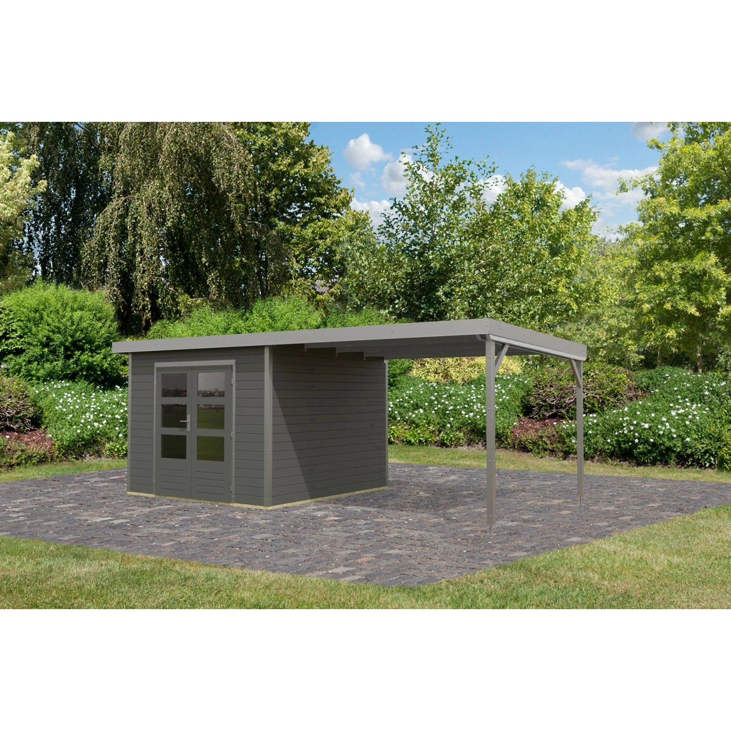 Karibu Gartenhaus Domingo B m. Anbaudach Terragrau/Grau 218,5 x 270 x 270 cm