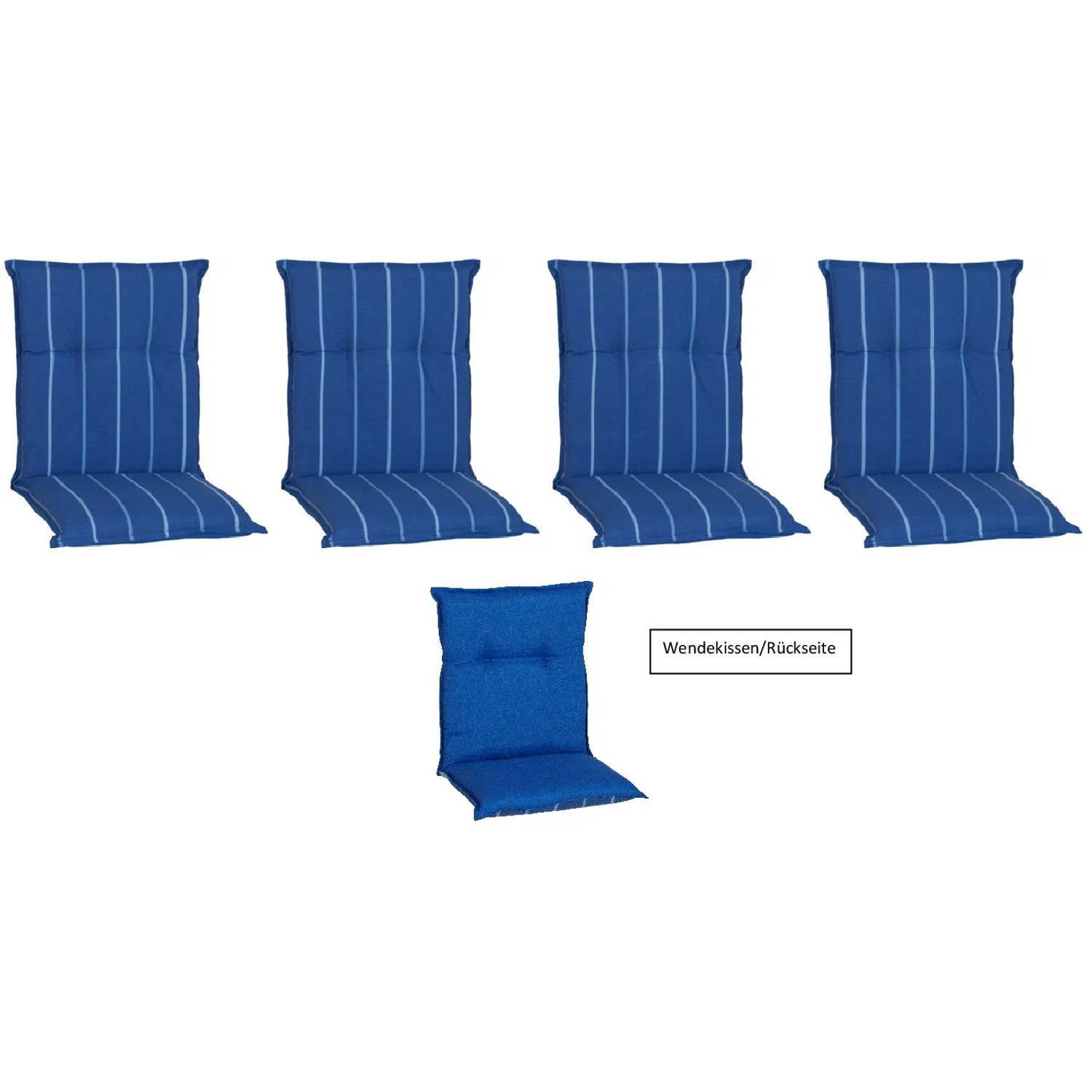 Ein zeitloses, elegantes Polster in blau / gestreift für Ihr Gartenmobiliar. Speziell passgenau für Niedriglehnerstühle. Maße: Länge ca. 98 cm x Breite ca. 46 cm x Stärke ca. 8 cm, waschbar (Handwäsche) bei 30 Grad, schadstofffrei nach neuestem Öko-Tex 100 Standard, beo Qualität seit 30 Jahren aus eigener Produktion in Handarbeit in eigener Produktion aus Europa, Bindebänder an der Sitzfläche / Schaumvlies Füllung / Gummiband im Lehnenbereich.