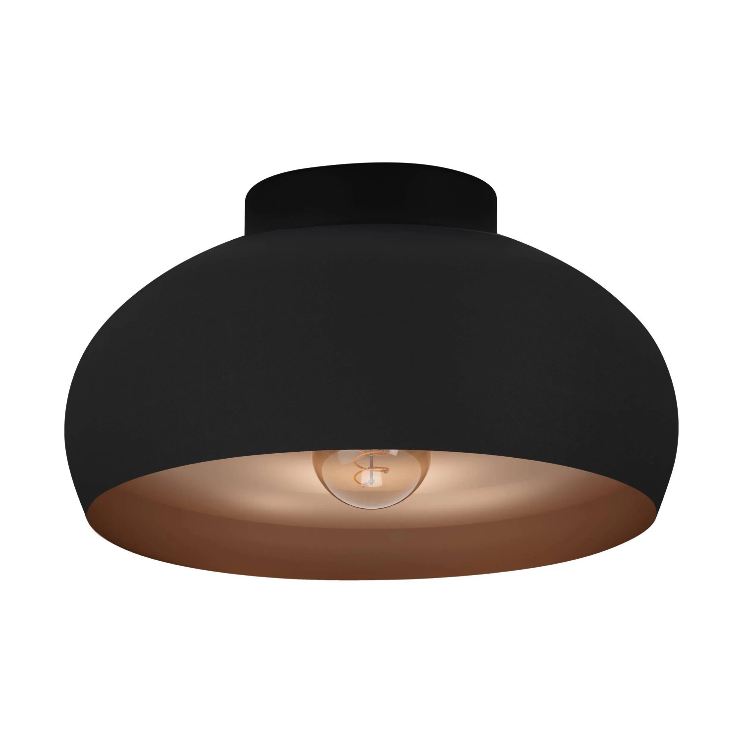 Die Deckenleuchte Mogano ist mit einem runden Lampenschirm aus schwarzem Metall und einer kupferfarbenen Innenseite gefertigt. Die Deckenlampe fügt sich nahtlos in moderne Einrichtungen ein. Sie bietet eine minimalistische Beleuchtung für jeden Raum - egal ob in der Küche, im Wohnzimmer, Schlafzimmer oder Flur. Das Filament-Leuchtmittel ist nicht im Lieferumfang enthalten. Geeignet ist die Leuchte für jedes Leuchtmittel mit E27-Sockel.