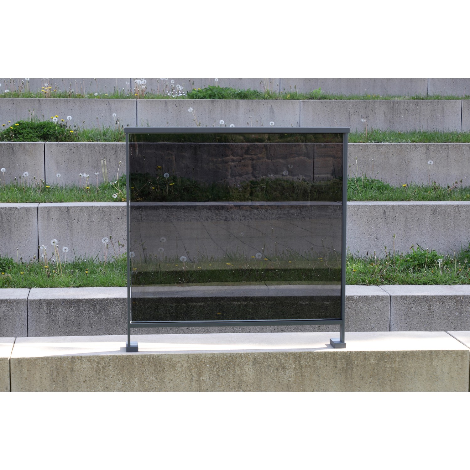 Die hochwertige Aluminiumverarbeitung versichert eine lange Lebensdauer und macht das Geländer-Set extrem witterungsbeständig, wodurch es ideal für den Einsatz im Außenbereich geeignet ist. Es ist in Anthrazit erhältlich, sodass es sich nahtlos in Ihr individuelles Design integrieren lässt. Der Glasaufbau kann in einem robusten Vario Grundgestell verarbeitet werden, das seperat erhältlich ist, wodurch das Geländer die praktischen Maße von 100 cm x 100 cm erreicht.