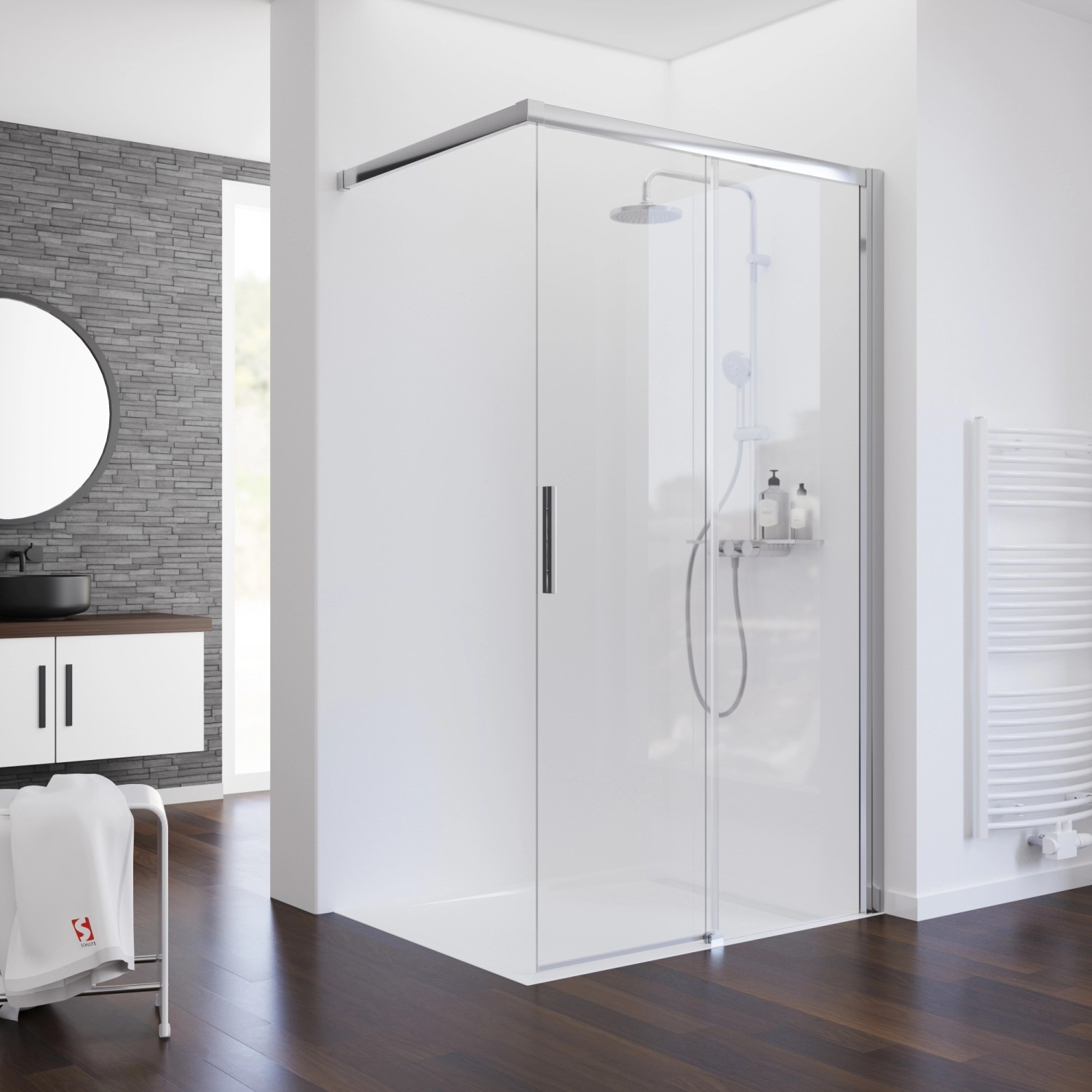 Die Schulte Schiebetür Walk In ohne unteres Profil ermöglicht Ihnen Ihr Badezimmer zu einer ästhetischen und komfortablen Wellnessoase zu verwandeln. Das widerstandsfähige Sicherheitsglas (Tür: 8 mm, Nebenteil: 6 mm Stärke) überzeugt gemeinsam mit der Profilfarbe Chromoptik durch das kristallklare Erscheinungsbild und sorgt für ein modernes Ambiente Ihres Bads.