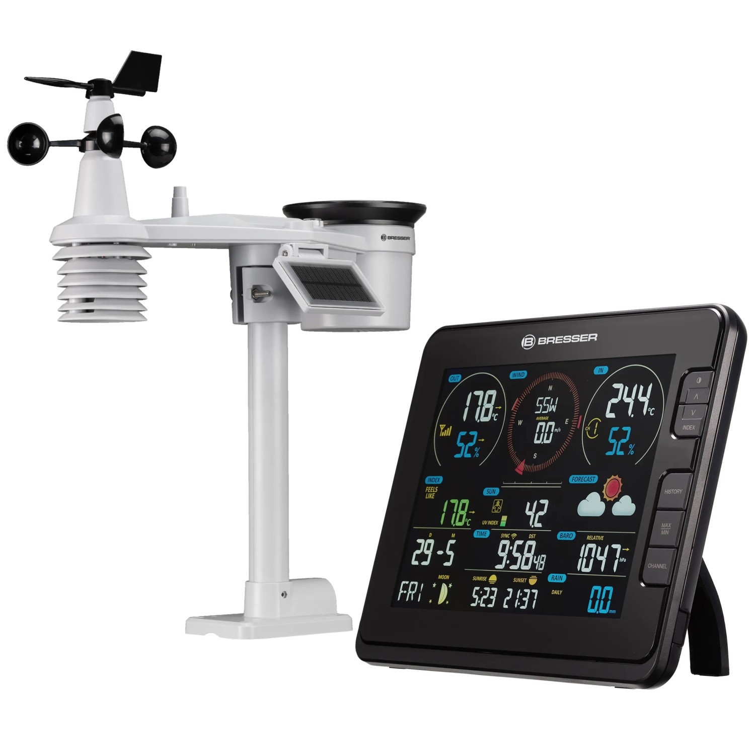 Die Bresser WLAN-Wetterstation Profi 7-in-1 bietet eine zuverlässige Übersicht über lokale Wetterdaten. Schnell installiert, zeigt sie auf ihrem modernen Farbdisplay zahlreiche Messwerte und Alltagsinformationen: Außentemperatur, Luftfeuchtigkeit, Windgeschwindigkeit und -richtung, UV-Index, Lichtintensität sowie die Niederschlagsmenge. Letztere kann tages-, wochen- oder monatsweise abgerufen werden - ideal zur Gartenbewässerung. Dank WLAN-Funktion lassen sich die Daten bequem über Plattformen wie WeatherCloud oder AWEKAS online veröffentlichen und jederzeit abrufen.