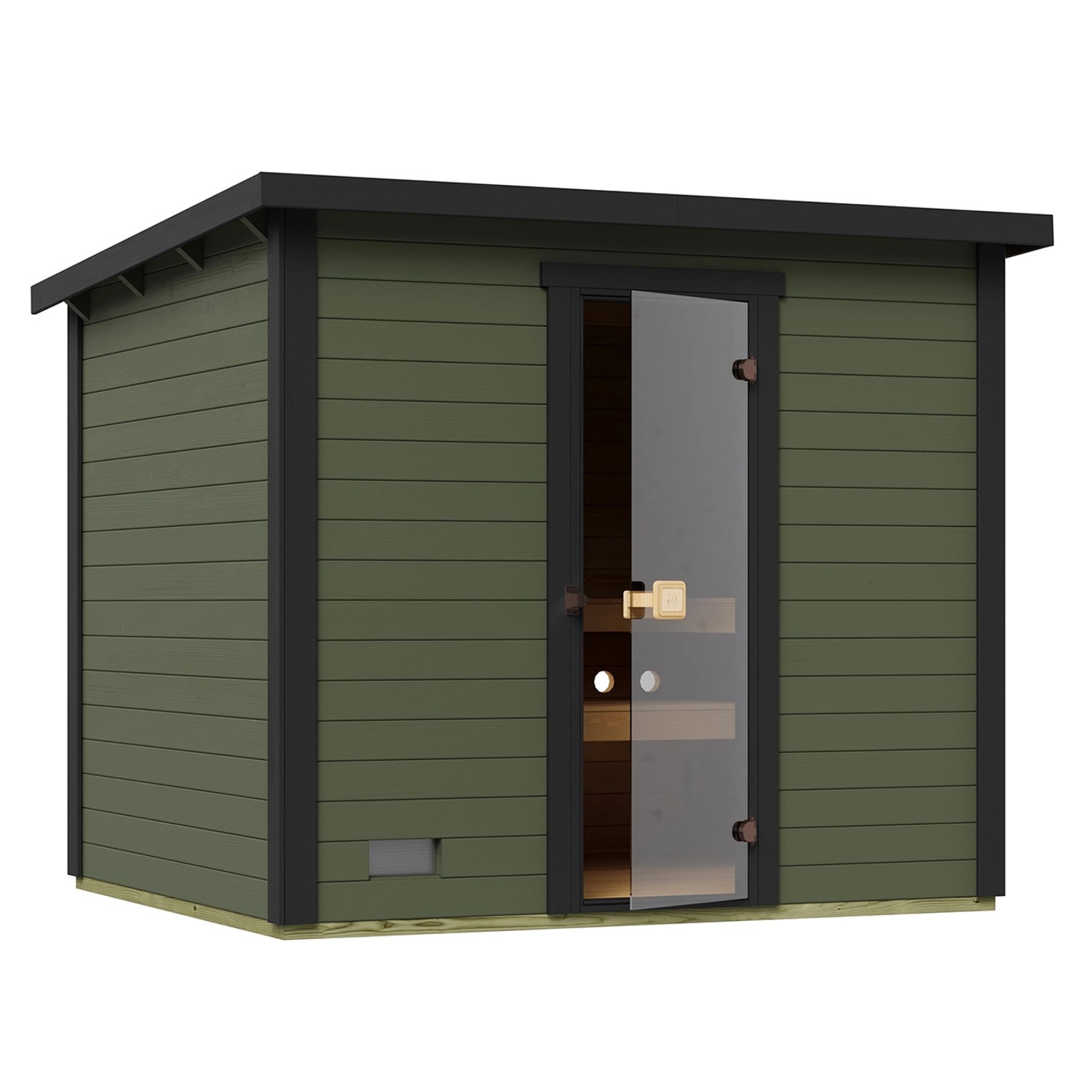 Die Wandbohlen des Saunahaus Kaapi sind außen in einer wetterfesten Farbe graugrün lasiert, um sie vor UV-Strahlung und Witterungseinflüssen zu schützen. So ist kein zeitaufwändiger Erstanstrich erforderlich und Sie können Ihr Saunahaus sofort nach dem Aufbau genießen.