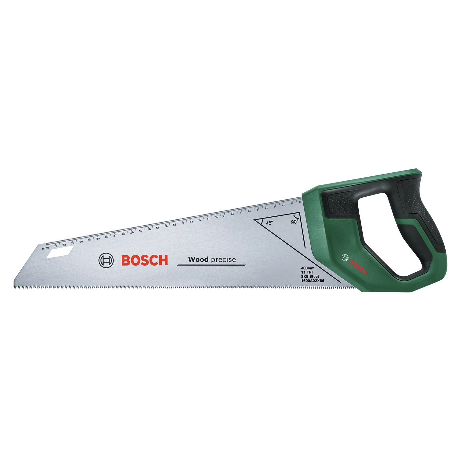 Mit diesem Werkzeug ist das Sägen ein reibungsloser und komfortabler Vorgang. Mit der praktischen, rückwärts verlaufenden metrischen 30 cm Skala an der Säge und der 45°- und 90°-Markierungsunterstützung können Maße direkt auf das Werkstück übertragen werden. Dank eines wiederverwendbaren Sägeblattschutzes ist diese Handsäge sicher zu transportieren und zu lagern.