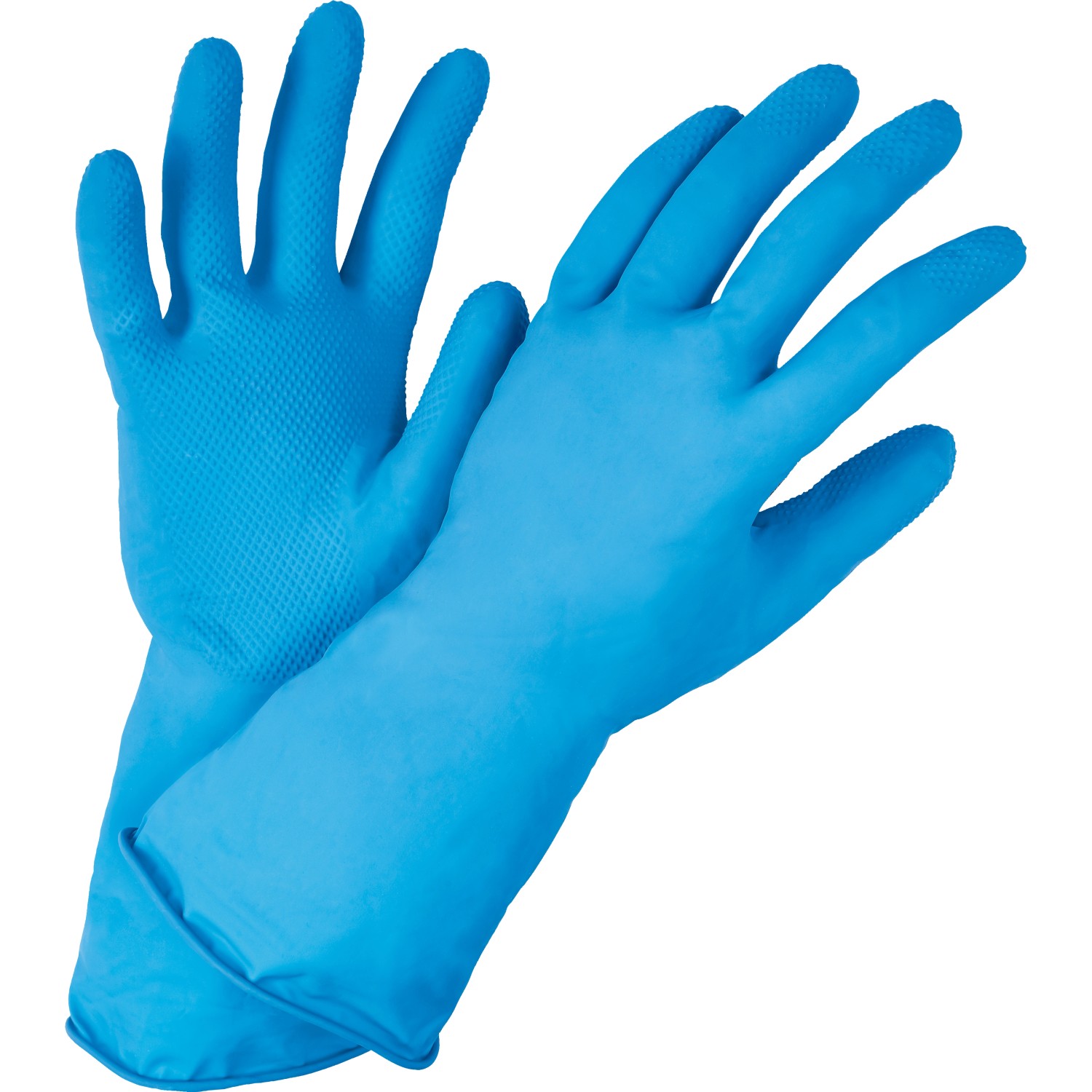 Mit dem Haushaltshandschuh in der Größe S sind ihre Hände vor Rissen und Verletzungen bei Haushaltsarbeiten geschützt. Der Kontakt mit Wasser oder Reinigungsmitteln beim Spülen, Putzen, Haare färben oder bei der Lebensmittelzubereitung wird verhindert. Das Material besteht aus hochwertigem und dehnbarem Latex, der ein elastischer Stoff aus Naturkautschuk ist. Er zeichnet sich durch seine Beständigkeit gegen nicht-aggressive Chemikalien aus und ist puderfrei. Die Innenseite verfügt über eine Baumwollbeflockung und ein spezielles Profil für eine besonders gute Griffigkeit. Der Handschuh ist in Blau ausgeführt. Im Lieferumfang ist ein Paar enthalten. Für Personen mit einer Latexallergie ist der Handschuh nicht geeignet. Die Lagerung sollte trocken, kühl und dunkel erfolgen.