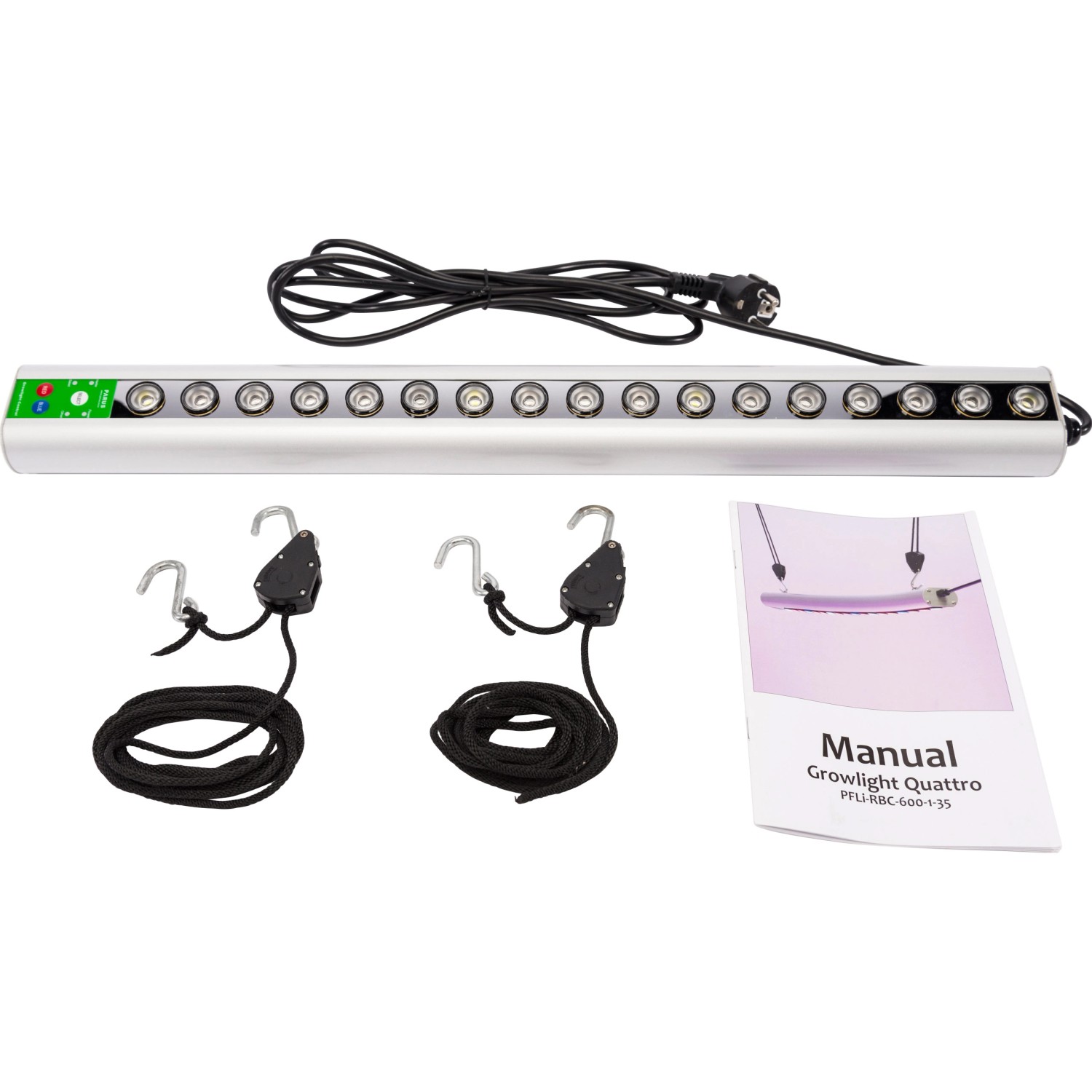 Details: - Stromversorgung: 90~245 VAC, 50~60 Hz - Beleuchtungswinkel: 90° - PPFD: 384 Mikromol m-2 s-1 (bei 20 cm Abstand) - Abmessungen: 650 mm (L) 60 mm (B) x 65 mm (H) - IP-Schutzklasse: IP54 - Sicherheitsklasse: UL,cUL,CE, EMC - Kabellänge: 3 m - Steckersystem: Schutz-Kontakt-Stecker - Gewicht: 1,97 kg