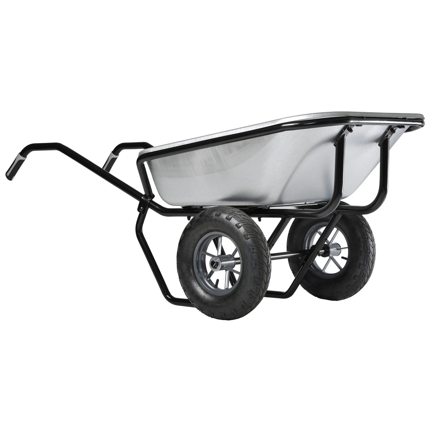 Mit dieser Zweirad-Schubkarre können Sie alle Arten von schweren Schüttgütern transportieren. Dabei überzeugt die Schubkarre mit ihren langen Griffholmen und einer guten Anhebeeigenschaft. Die verzinkte Mulde ist nicht nur robust, sondern verleiht der Zweiradkarre zudem eine ansprechende Optik. Sie ist mit einem Kippbügel, einer Muldeneinbettung und 400 mm rollengelagerten Lufträdern ausgestattet. Die Konstruktion erlaubt eine gleiche Lastenverteilung auf beide Räder. Die Schubkarre ist bereits montiert.