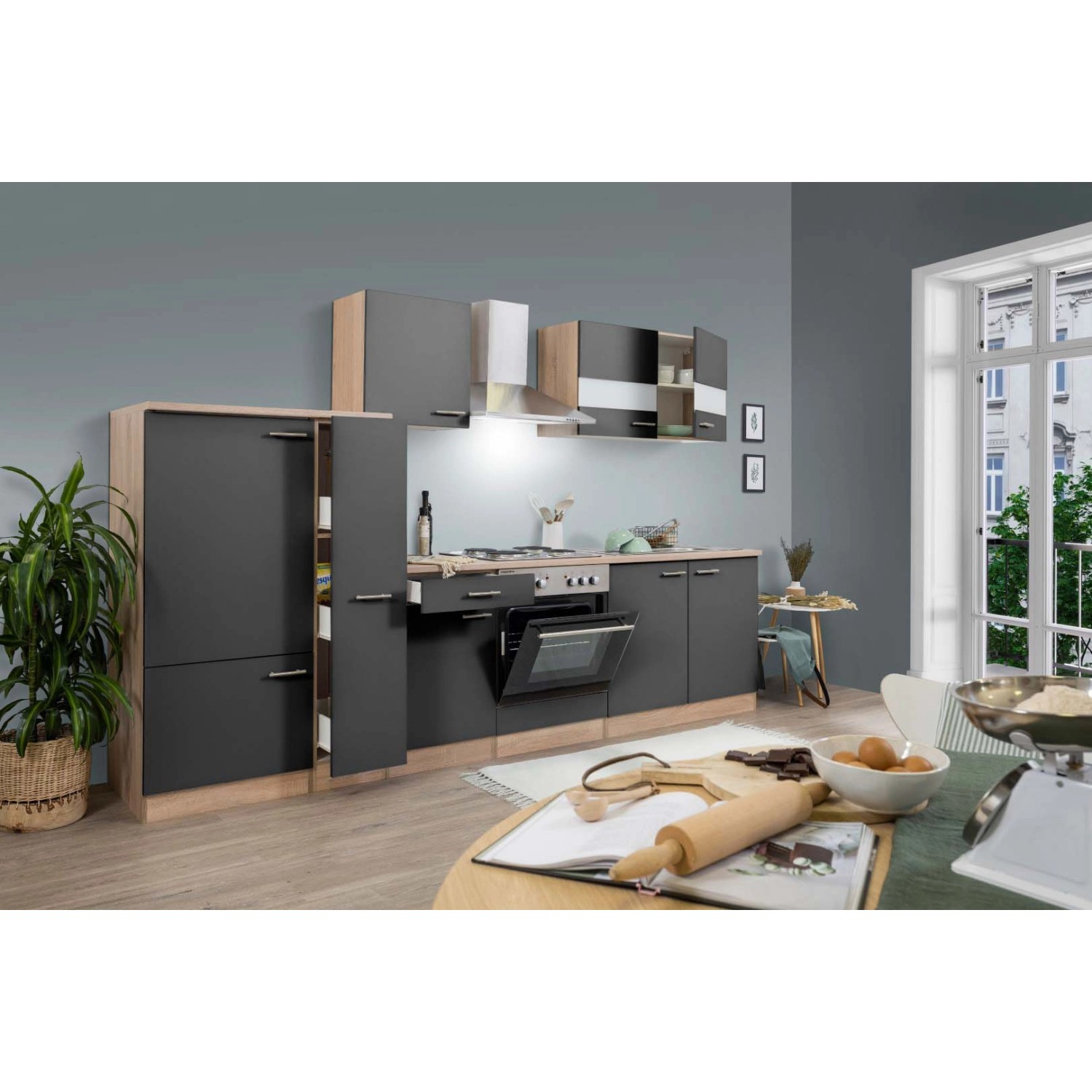 1 Apothekerschrank: 146,8 cm x 30 cm x 55,5 cm 1 Kühlschrankumbau: 146,8 cm x 60 cm x 55,5 cm 1 Unterschrank mit Schublade: 82 cm x 50 cm x 55,5 cm 1 Herdumbauschrank: 82 cm x 60 cm x 55,5 cm 1 Spülenunterschrank: 182 cm x 100 cm x 55,5 cm 1 Oberschrank: 56,1 cm x 50 cm x 33 cm 1 Oberschrank mit Glaseinlagen in den Türen: 56,1 cm x 100 cm x 33 cm 1 Arbeitsplatte Eiche-Sägerau (Nachbildung), ohne Ausschnitte, 28 mm Stärke Front Grau, Korpus Eiche-Sägerau (Nachbildung) Stangengriffe aus Metall in Edelstahl-Look Alle Scharniere der Türen mit Soft-Close-Funktion Arbeitshöhe: 84,8 cm