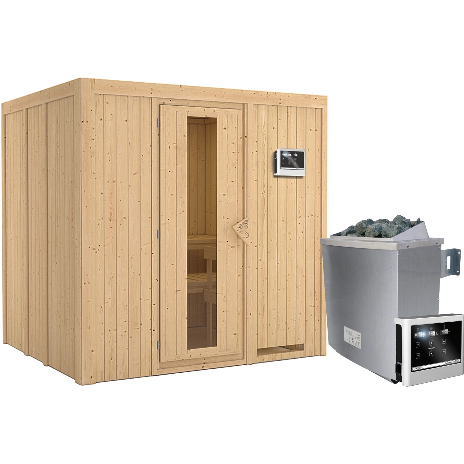 Karibu Sauna-Set Stina inkl. Ofen 9 kW mit ext. Steuerung, Energiespartür