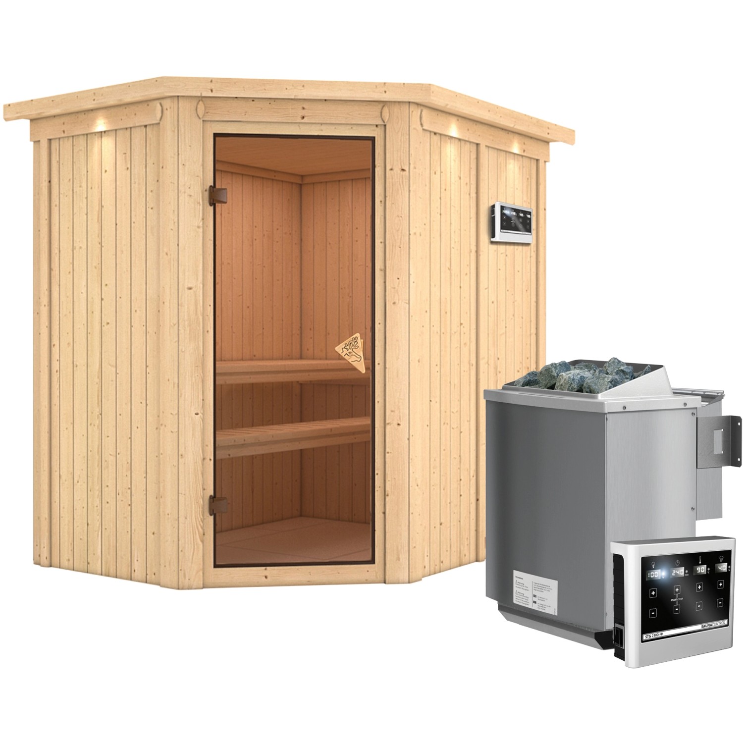 Karibu Sauna-Set Cleo inkl. Bio-Ofen 9 kW mit ext. Steuerung, Dachkranz