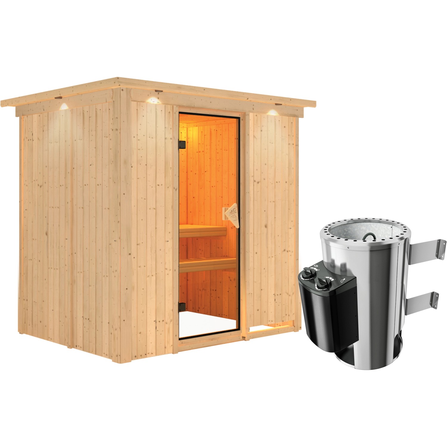 Karibu Sauna Finja mit Ofen intergrierte Stg.LED-Dachkranz Natur