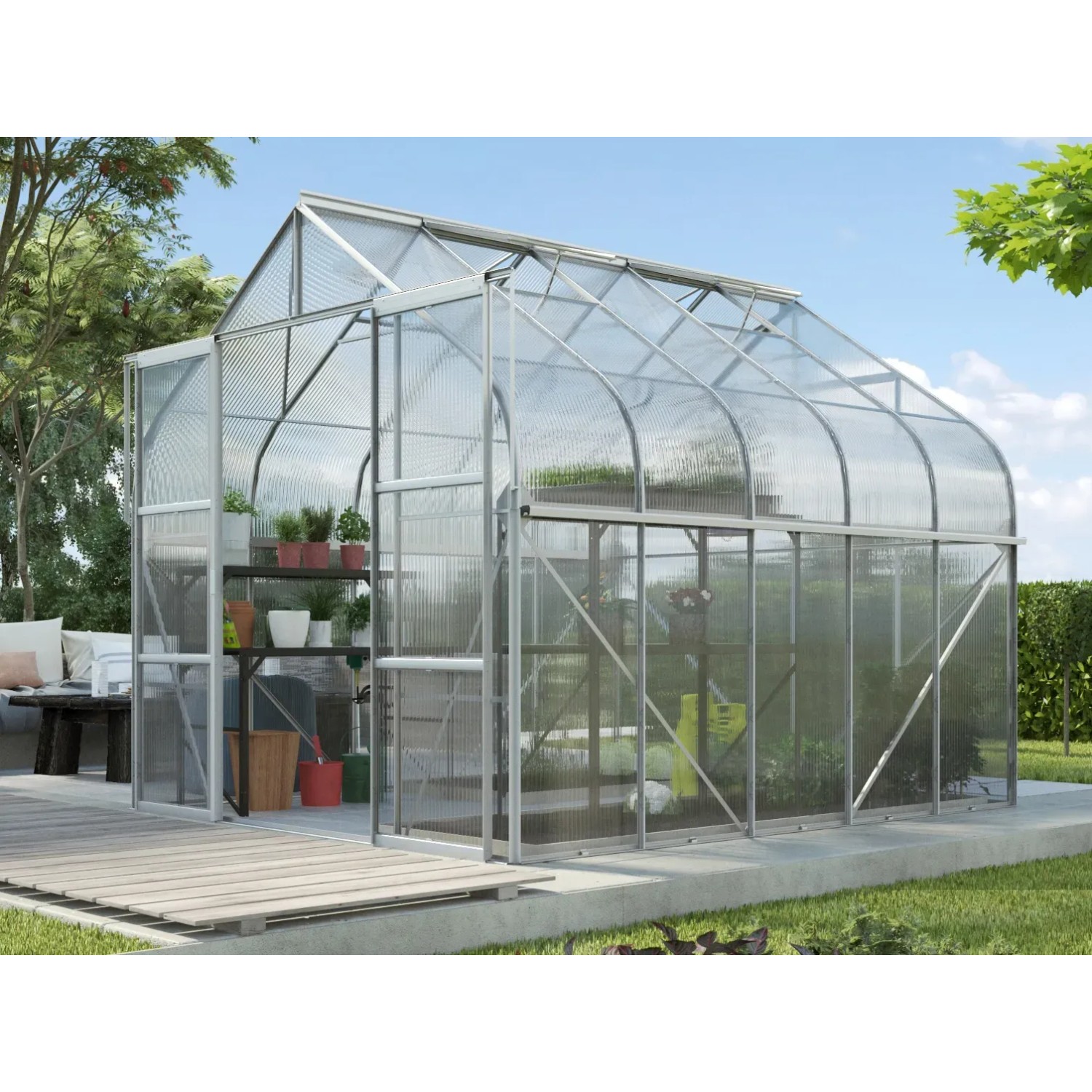 Die eloxierten Oberflächen der hochwertigen Aluminiumkonstruktion sorgen für lang anhaltenden Schutz gegen Korrosion und Verwitterung. Des Weiteren sorgen die rechts und links geschlossenen Kanten der Verglasung für eine zusätzliche Stabilität der HKPs. Durch die außergewöhnliche Räumlichkeit und Höhe des Gewächshauses sind die optimalen Bedingungen für eine üppige Ernte und hochwachsende Pflanzen gegeben.
