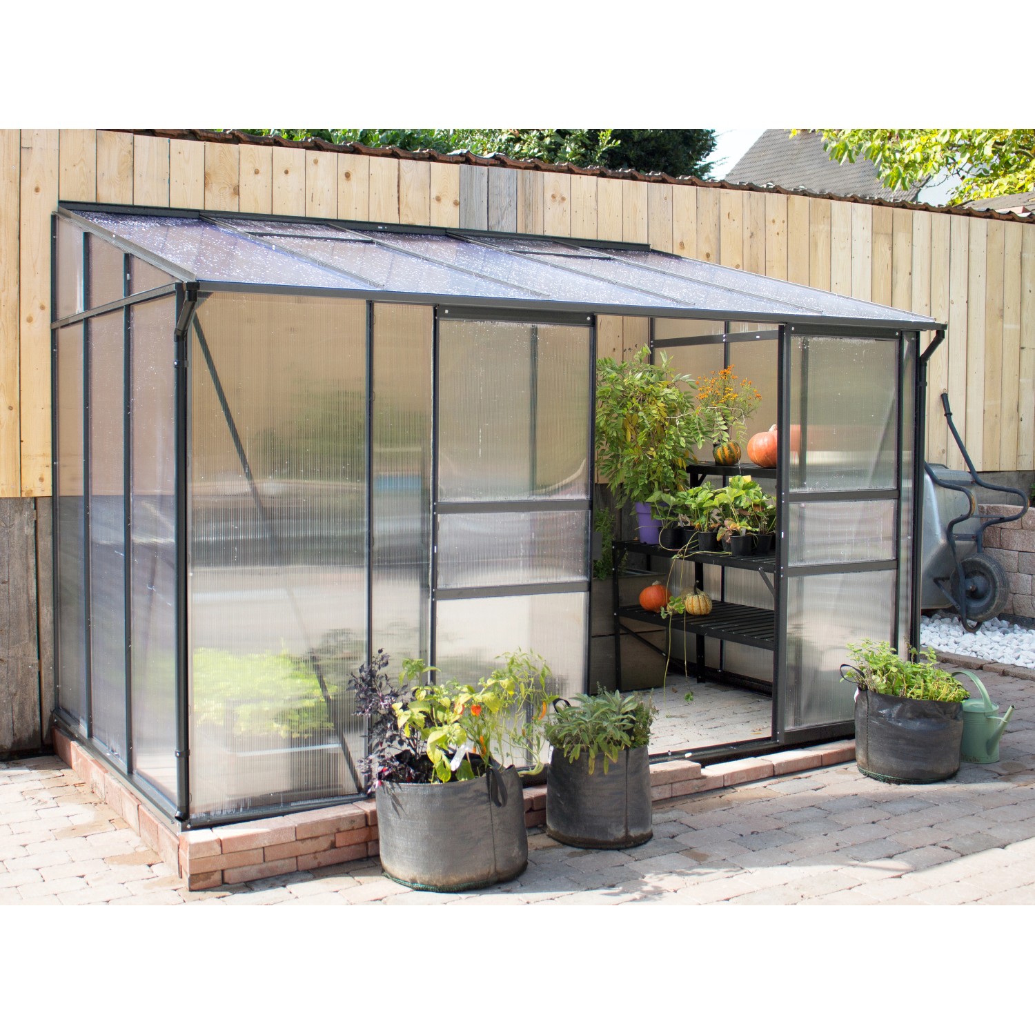 Die Eindeckung trägt im Zusammenspiel mit dem Rahmen aus pulverbeschichtetem Aluminium in trendigem Schwarz zur hervorragenden Wärmedämmung des Gewächshauses bei. Der Aufbau ist dank des Steck- & Schraubsystems sehr einfach und schnell erledigt. Die Konstruktion mit Pultdach überzeugt durch die Einfachheit und gute Belüftung und eignet sich gut für den Anbau von Pflanzen in Reihen und Regalen. Die Regenrinne sorgt zudem für einen guten Ablauf des Regenwassers.