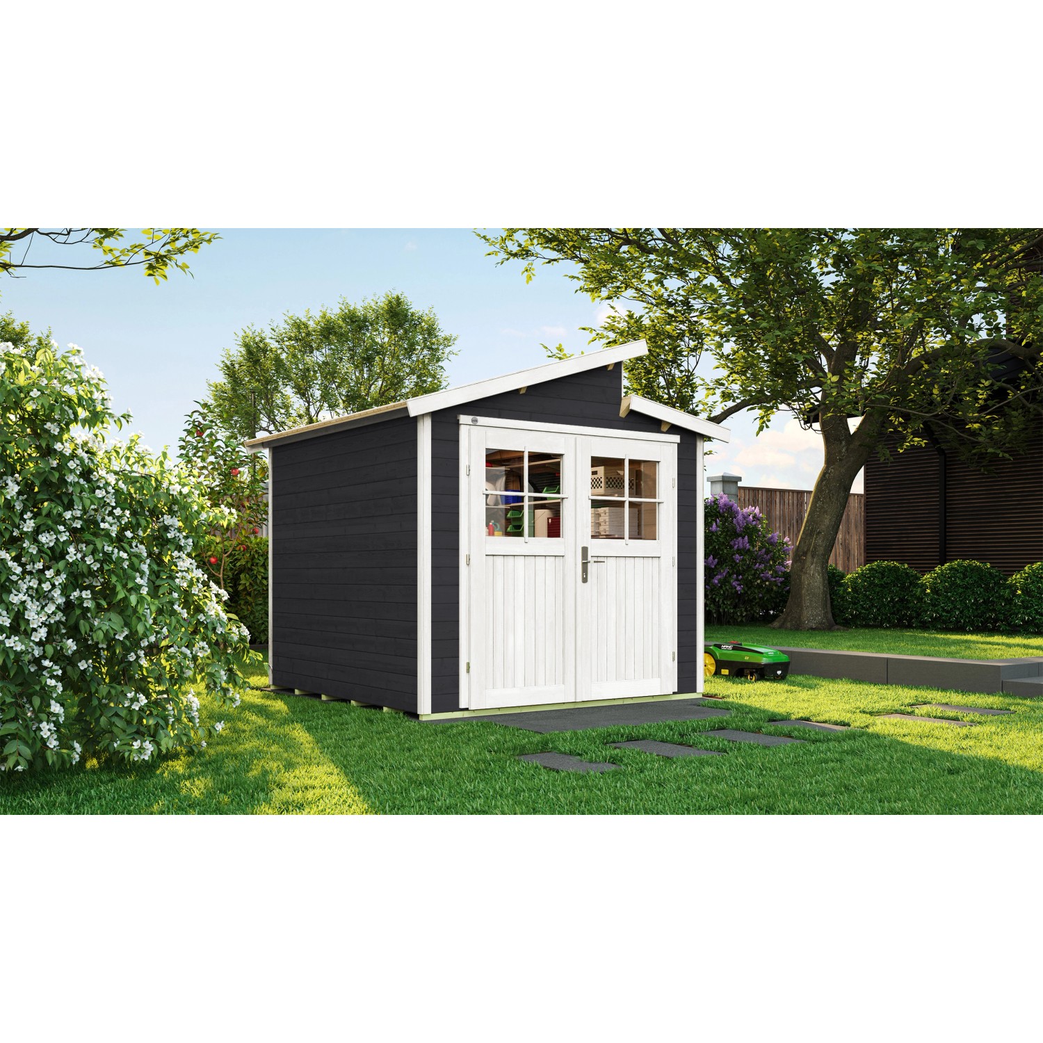 Das Gartenhaus überzeugt durch sein modernes Design und ist dabei in der Farbe Anthrazit gehalten. Es eignet sich besonders zur Aufbewahrung von Gegenständen.