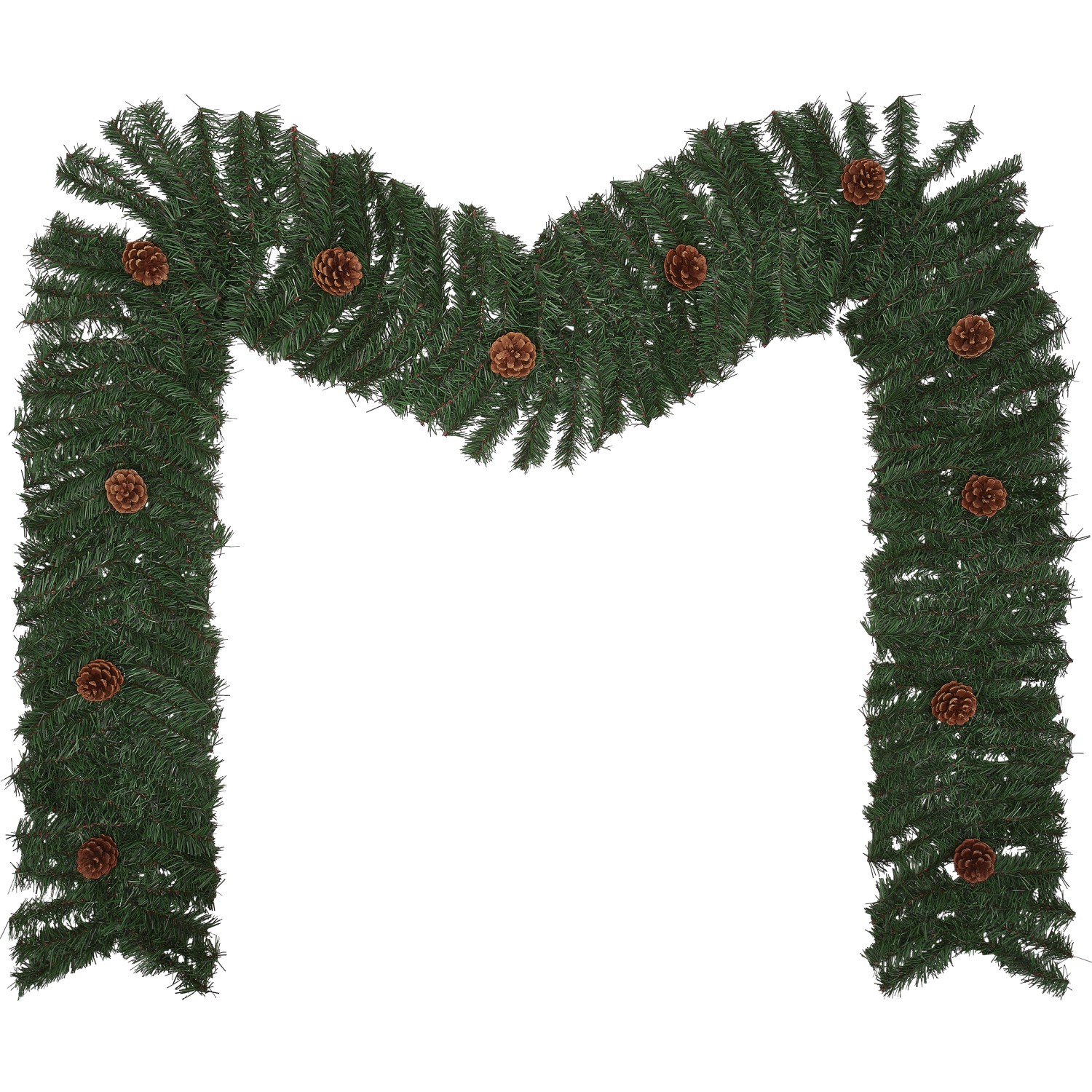 Die wiederverwendbare Kunsttannengirlande dient zur winterlichen Dekoration von Türen oder dem Kaminsims. Ihre 180 Zweige sind echten Tannenzweigen naturgetreu nachempfunden. Sie besitzt eine Gesamtlänge von 270 cm. Hergestellt ist die Weihnachtsdeko aus PVC-Kunststoff in der Farbe Dunkelgrün. Dank der Drahtbasis können alle Zweige in die gewünschte Richtung gebracht werden. Als Verzierung verfügt die Girlande über 12 kanadische Tannenzapfen, welche über die gesamte Länge verteilt sind. Die Tannenzapfengirlande kann im Innen- und Außenbereich genutzt werden.